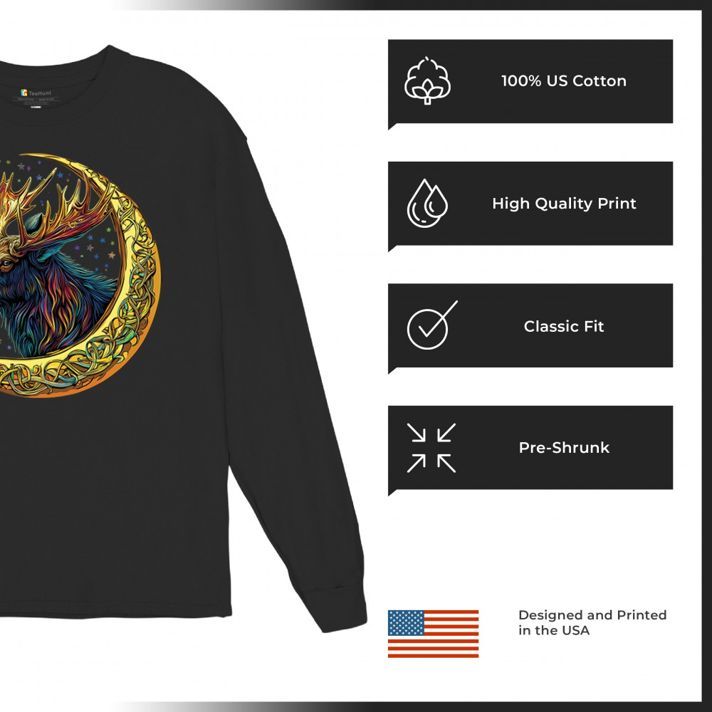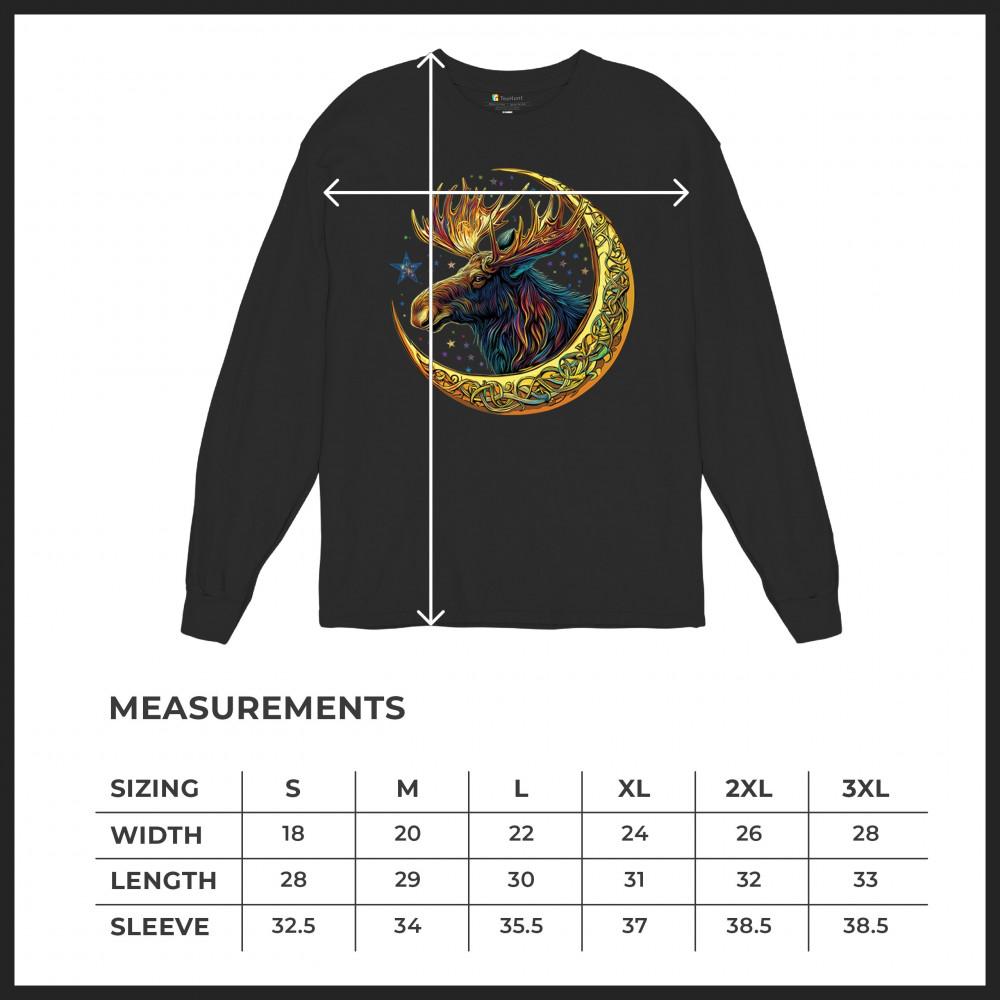 Mystical moose in gold Celtic crescent moon design—symbolizes strength, nature wisdom, and cosmic spirit for fantasy lovers and woodland fans.