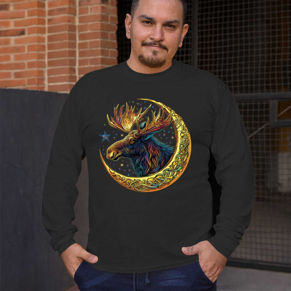 This vibrant moose design blends tribal art and fantasy energy with a golden Celtic crescent moon. Cosmic fur, radiant antlers, and a star-speckled sky make this image a symbol of strength, natural wisdom, and mysticism. Ideal for druids, hunters, fantasy fans, or spirit animal seekers connected to the forest and celestial realm.