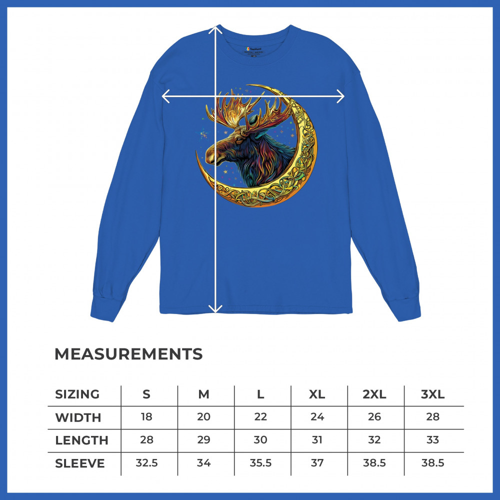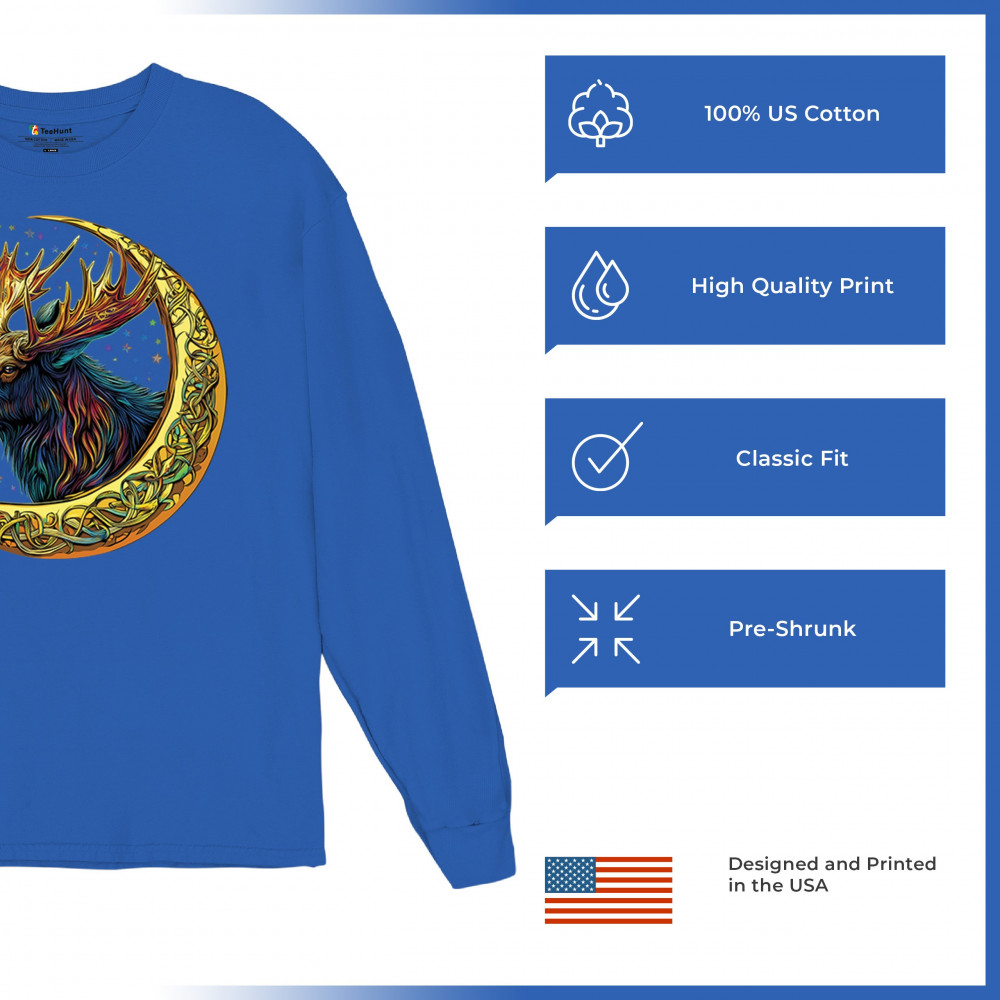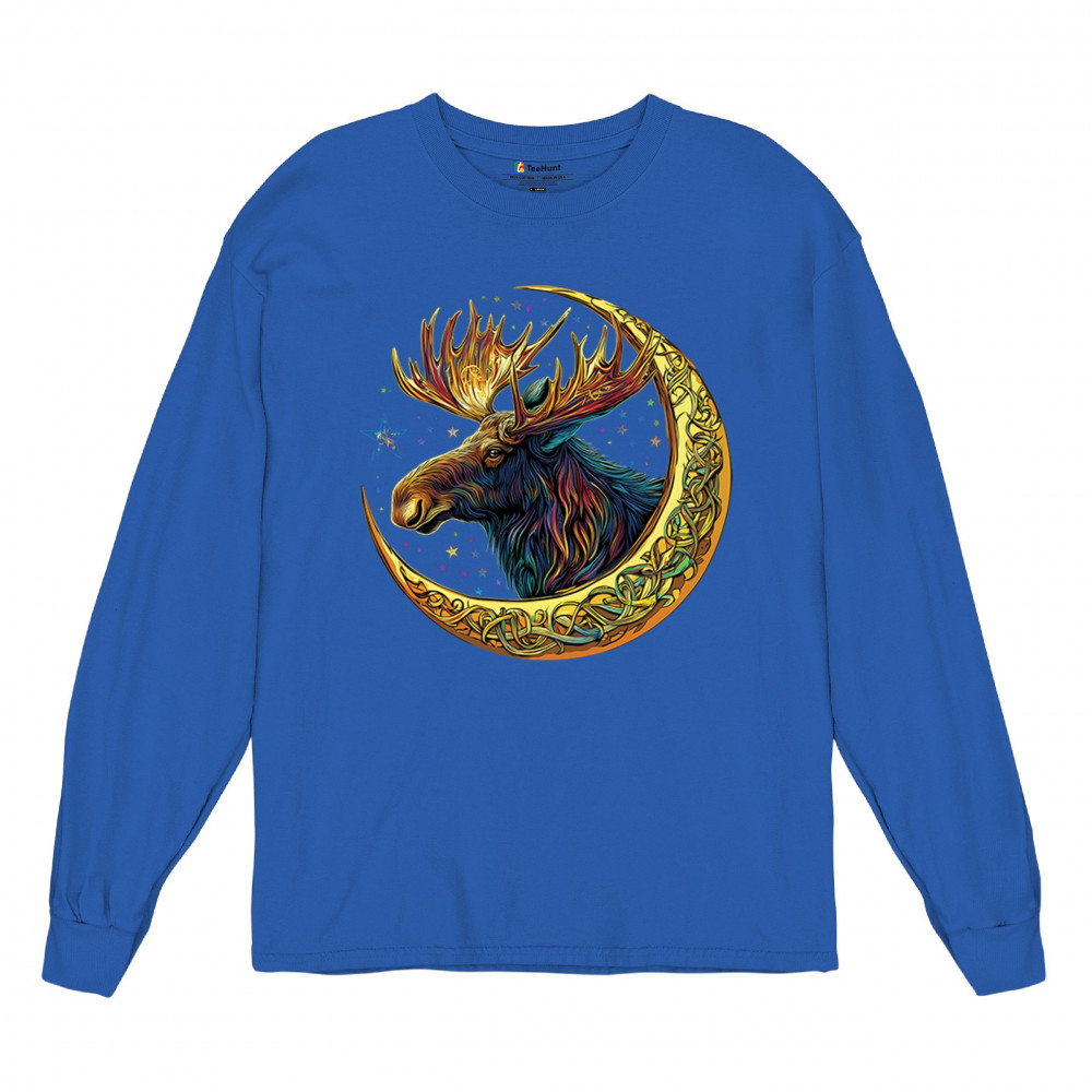 Mystical moose in gold Celtic crescent moon design—symbolizes strength, nature wisdom, and cosmic spirit for fantasy lovers and woodland fans.