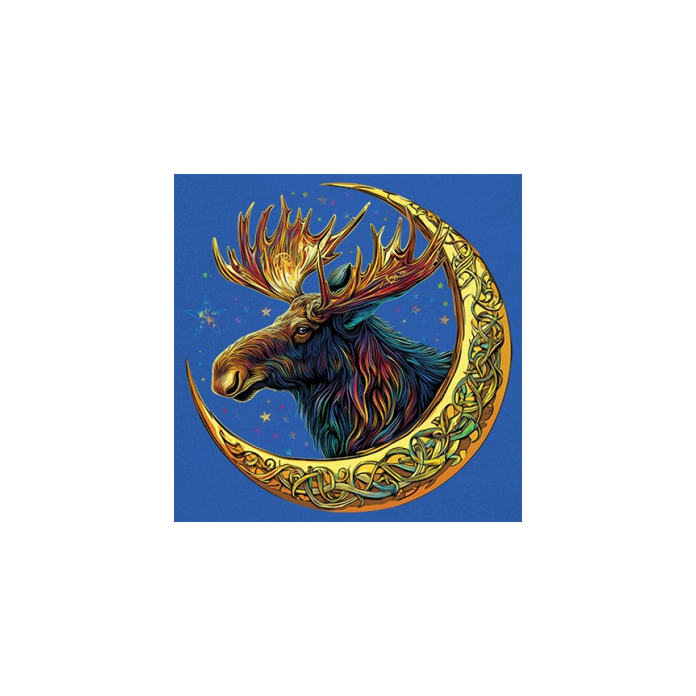 This vibrant moose design blends tribal art and fantasy energy with a golden Celtic crescent moon. Cosmic fur, radiant antlers, and a star-speckled sky make this image a symbol of strength, natural wisdom, and mysticism. Ideal for druids, hunters, fantasy fans, or spirit animal seekers connected to the forest and celestial realm.