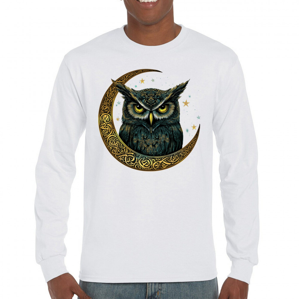 Cosmic owl in Celtic crescent moon—symbol of wisdom, night mystery, and spirit. Perfect for mystics, owl lovers, and fantasy fans.