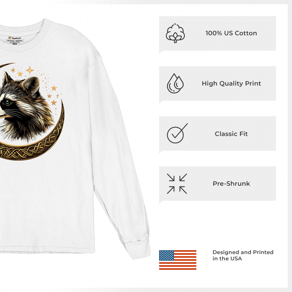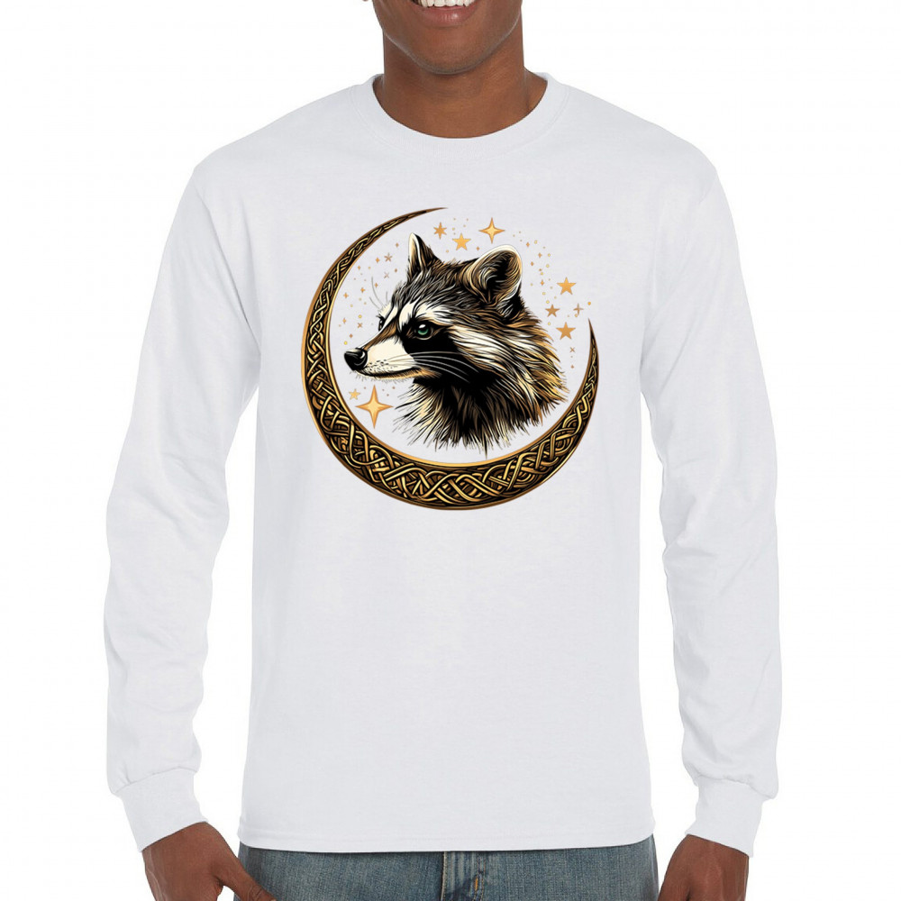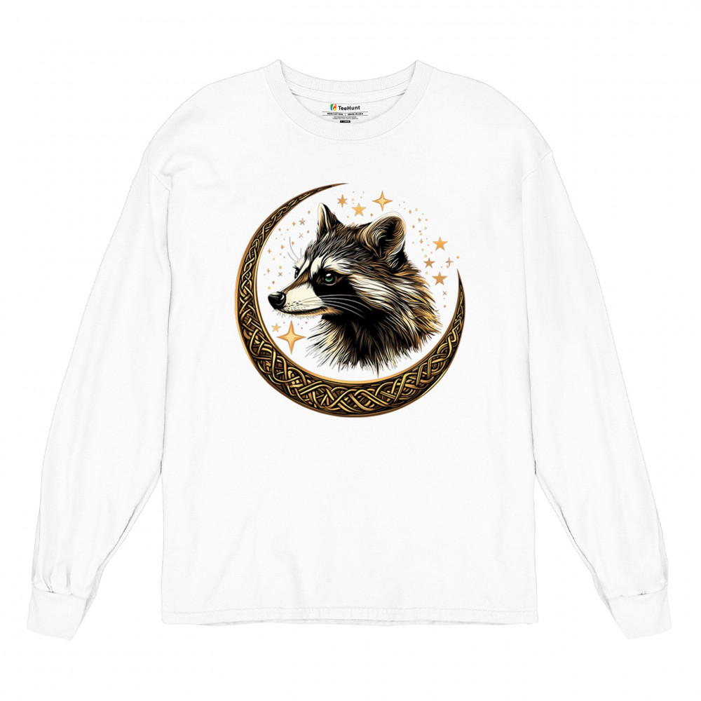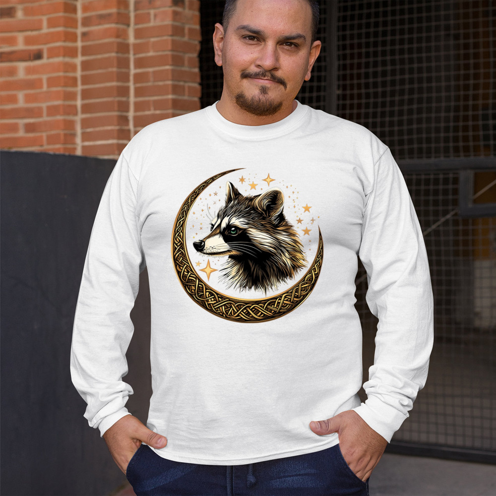 Cosmic raccoon design in Celtic moon. Symbol of adaptability, mystery, and spiritual intelligence. A perfect gift for wild and curious souls.