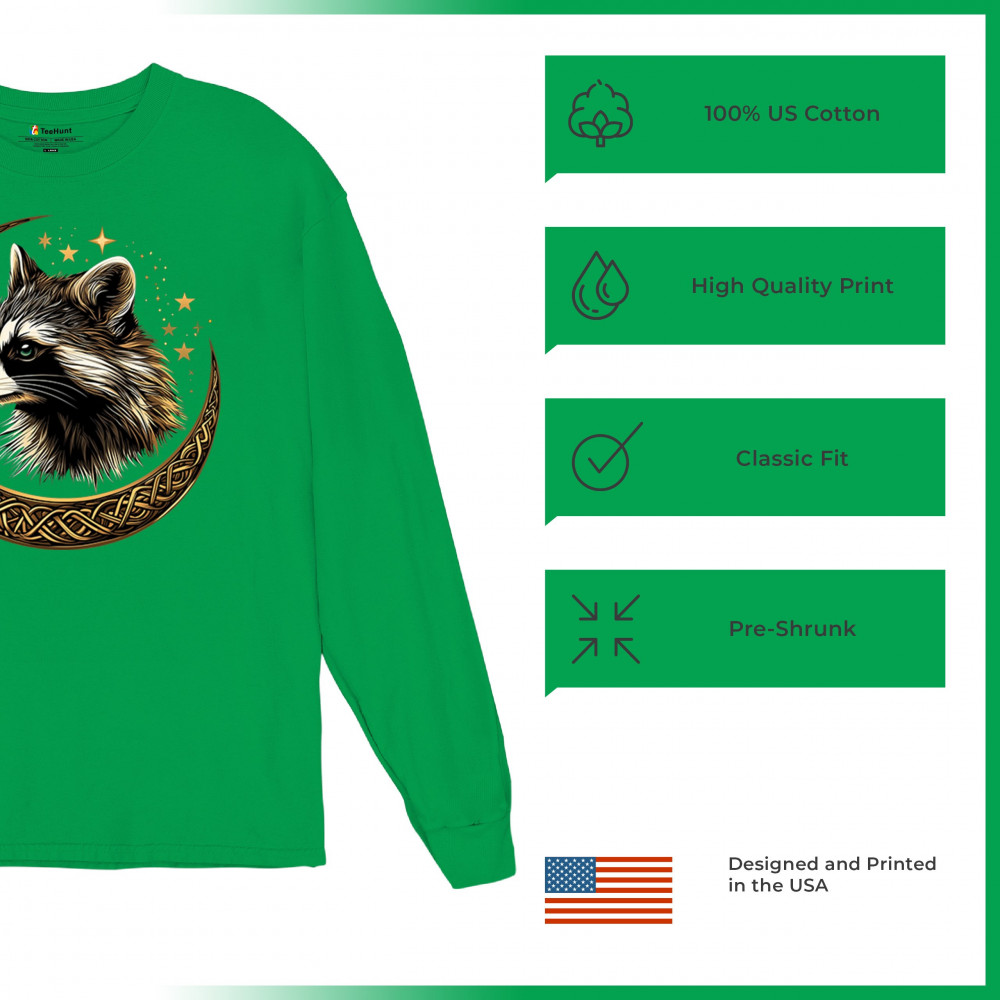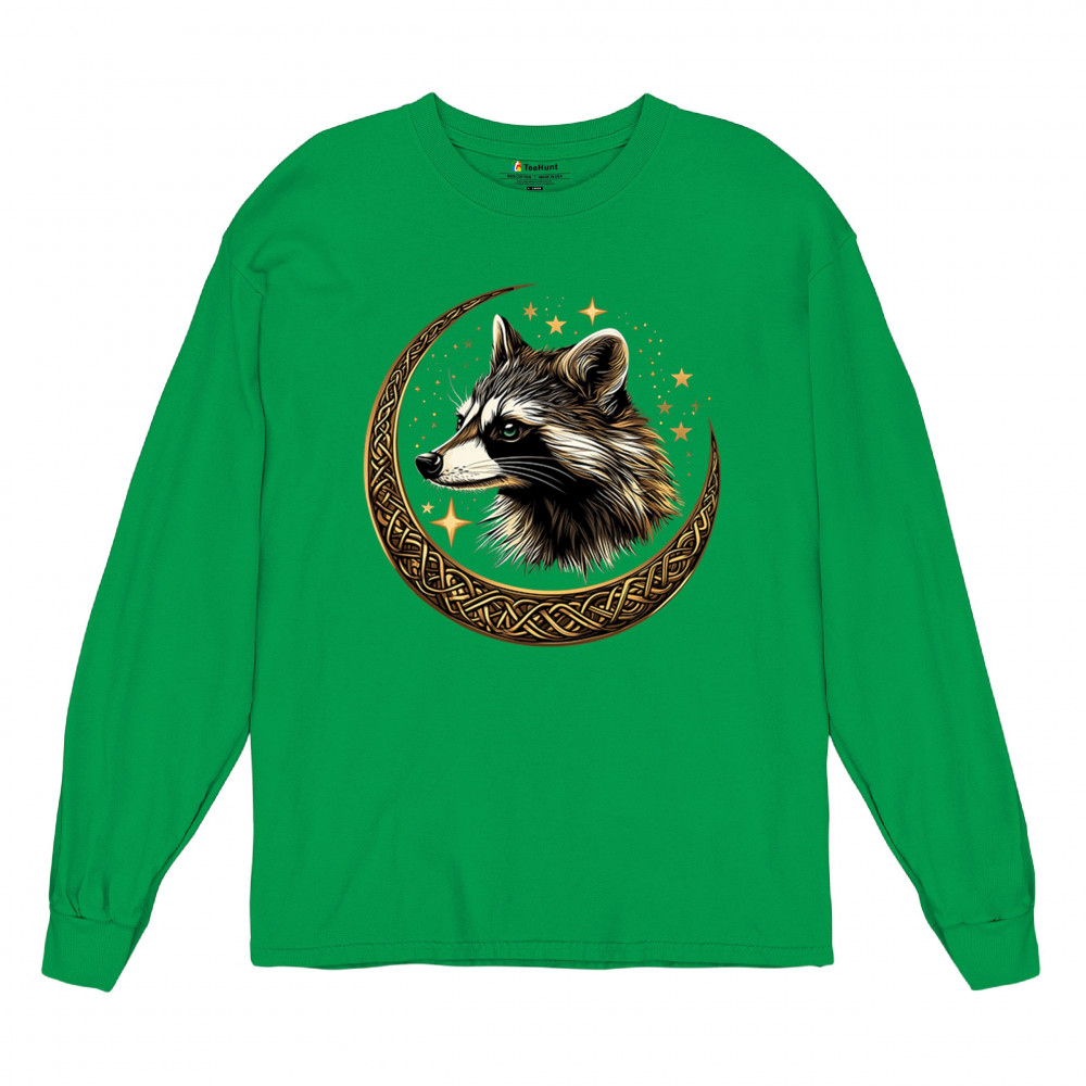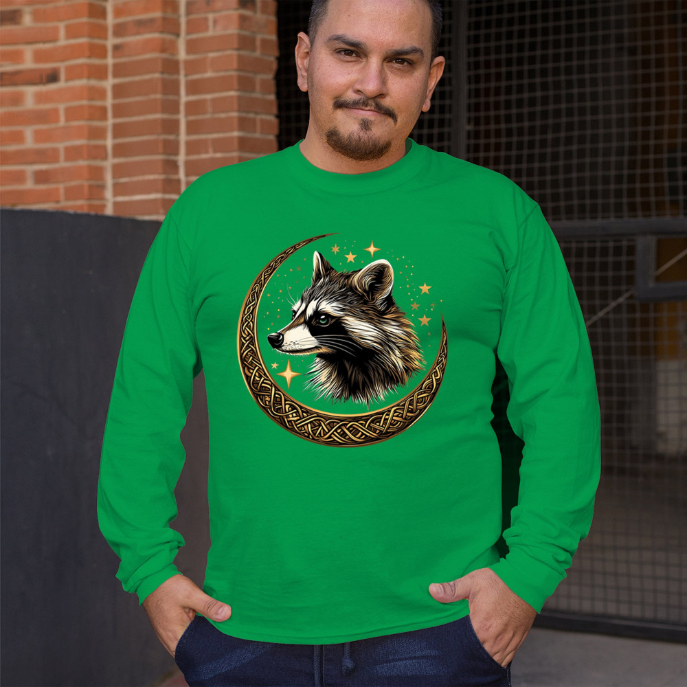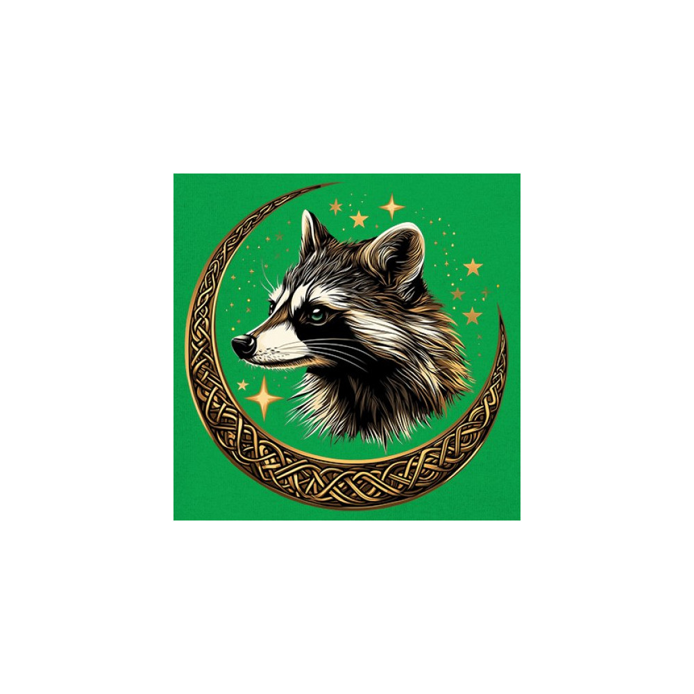 Cosmic raccoon design in Celtic moon. Symbol of adaptability, mystery, and spiritual intelligence. A perfect gift for wild and curious souls.