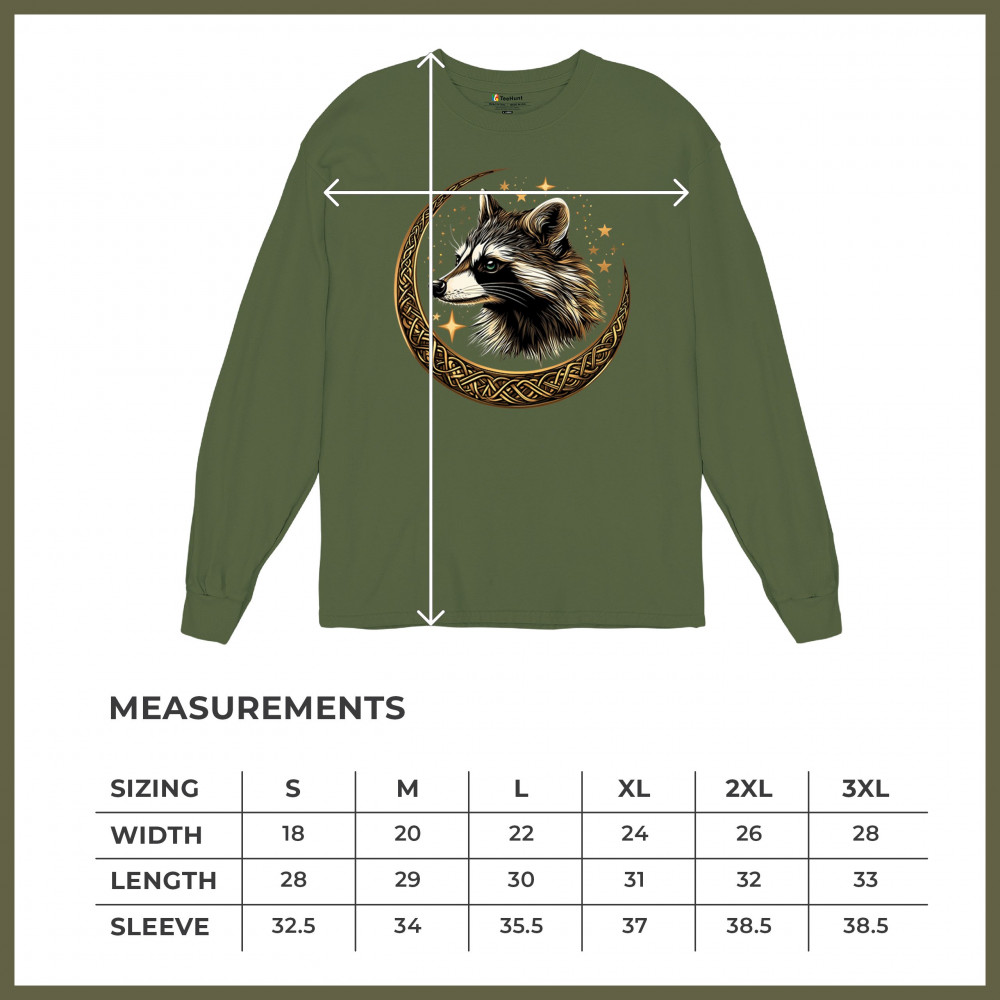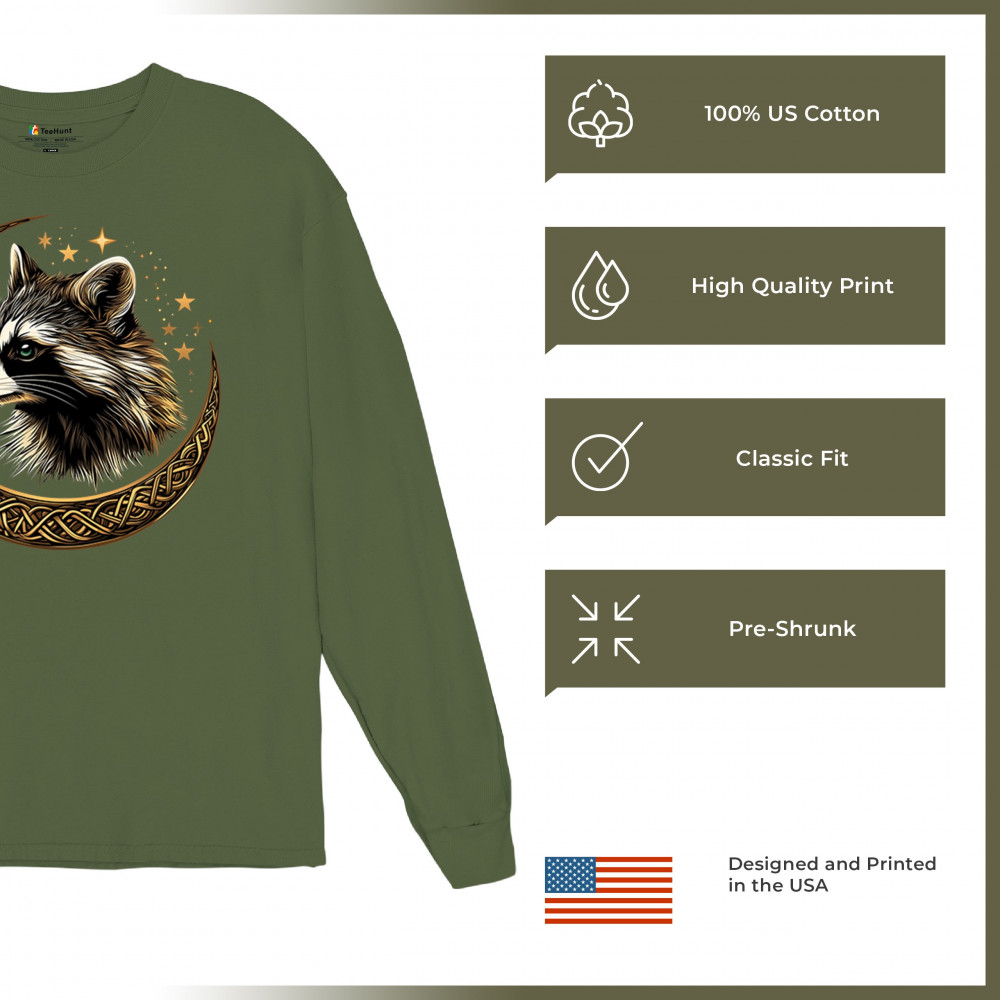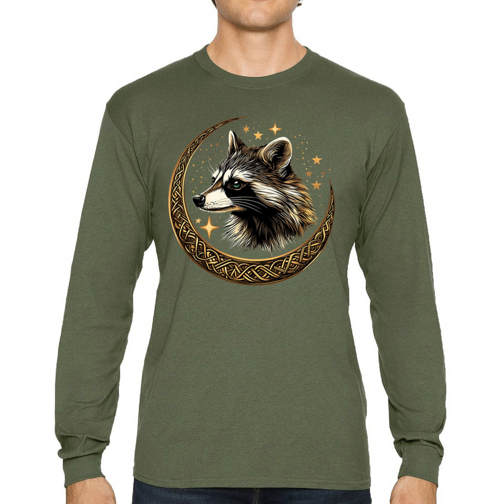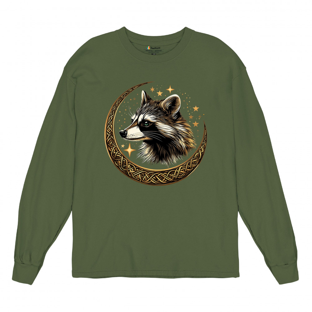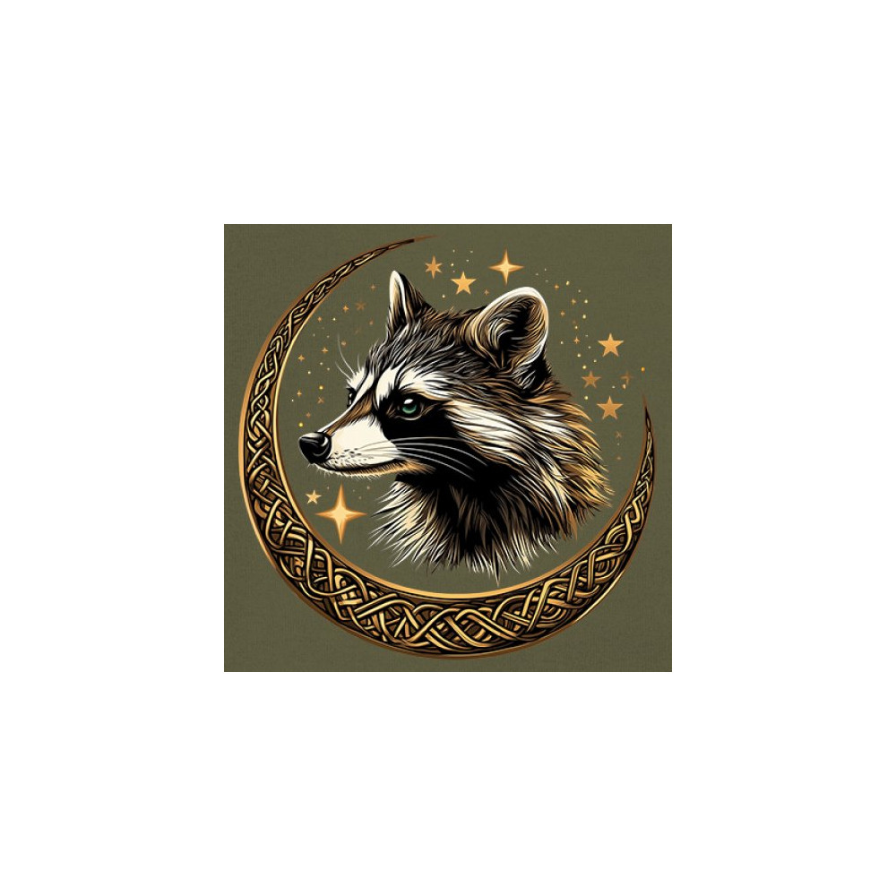 Cosmic raccoon design in Celtic moon. Symbol of adaptability, mystery, and spiritual intelligence. A perfect gift for wild and curious souls.