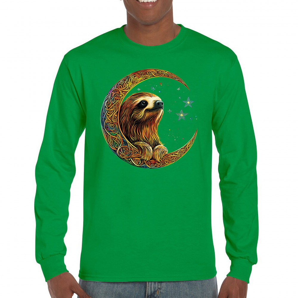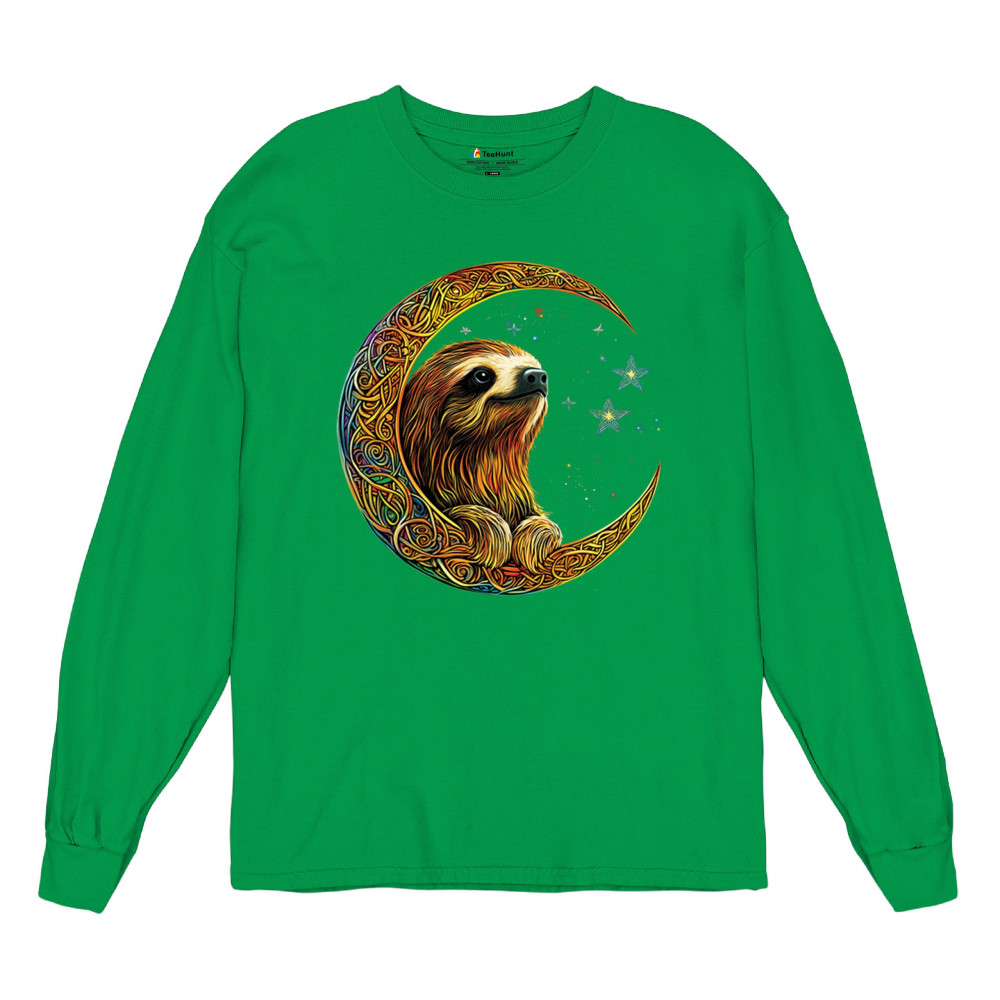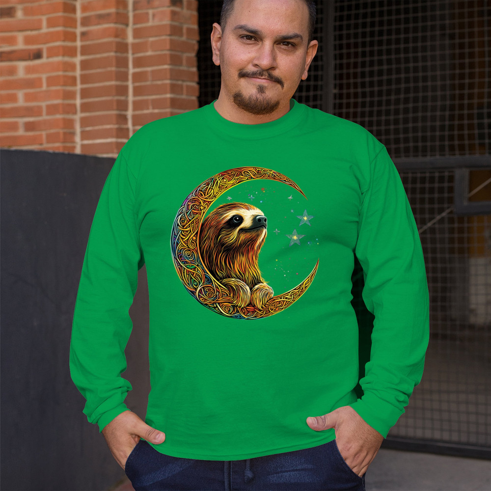 Celebrate peace and presence with this stunning sloth design cradled in a gold Celtic crescent moon. Surrounded by a vibrant starry sky, the image blends jungle whimsy with tribal patterns and mystical vibes. A perfect design for lovers of fantasy animals, mindfulness, and slow living. A beautiful tribute to spiritual stillness and cosmic calm.