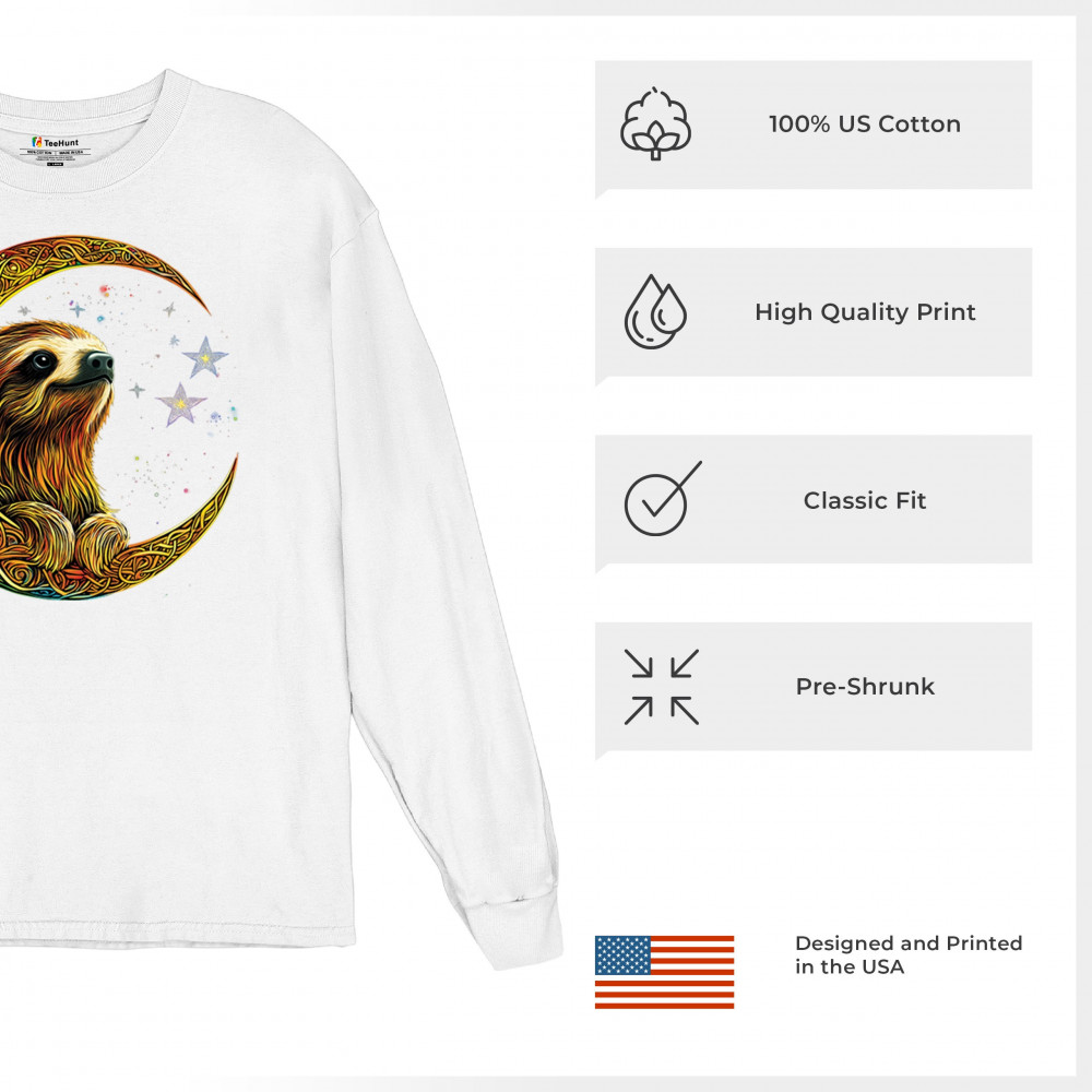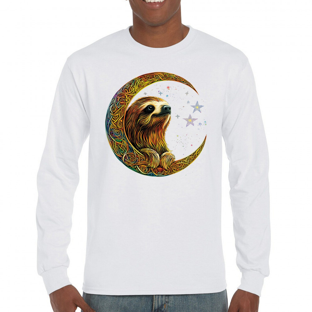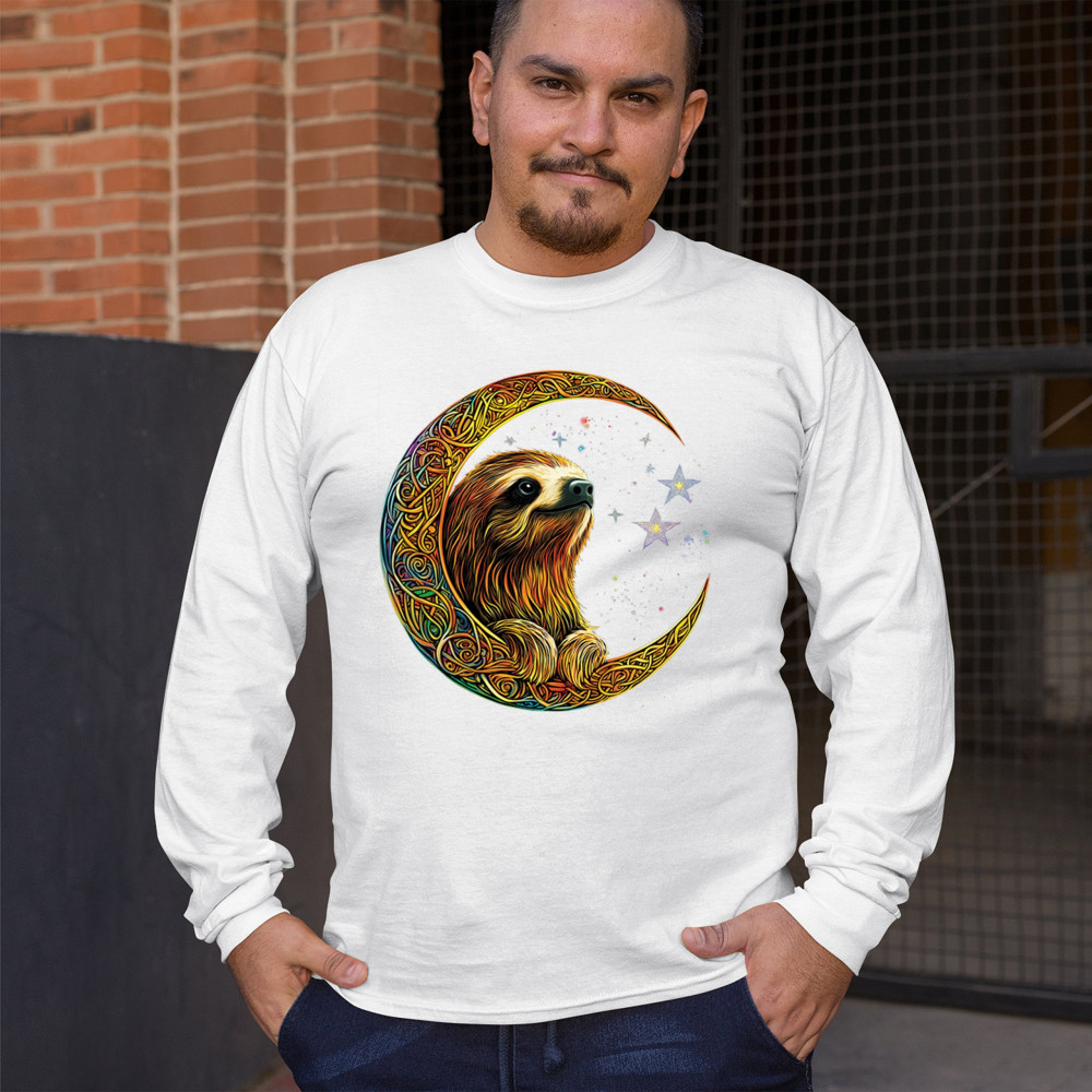 Celebrate peace and presence with this stunning sloth design cradled in a gold Celtic crescent moon. Surrounded by a vibrant starry sky, the image blends jungle whimsy with tribal patterns and mystical vibes. A perfect design for lovers of fantasy animals, mindfulness, and slow living. A beautiful tribute to spiritual stillness and cosmic calm.
