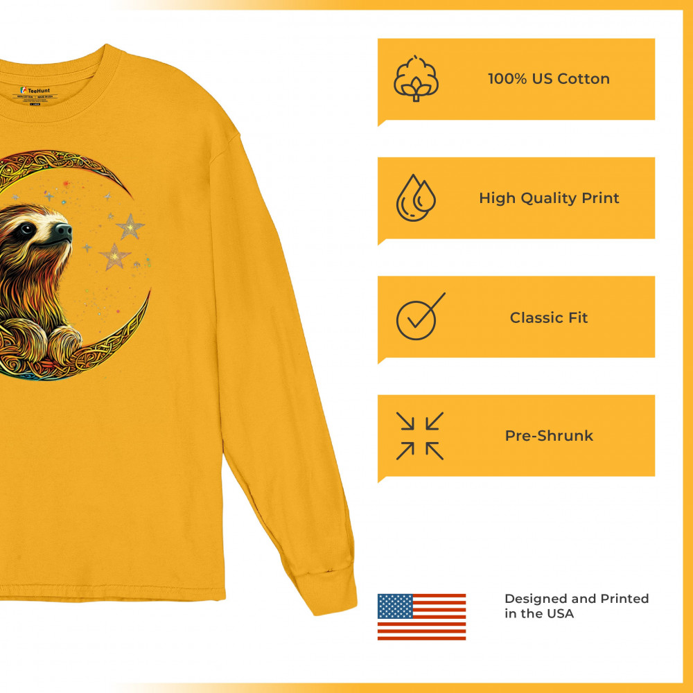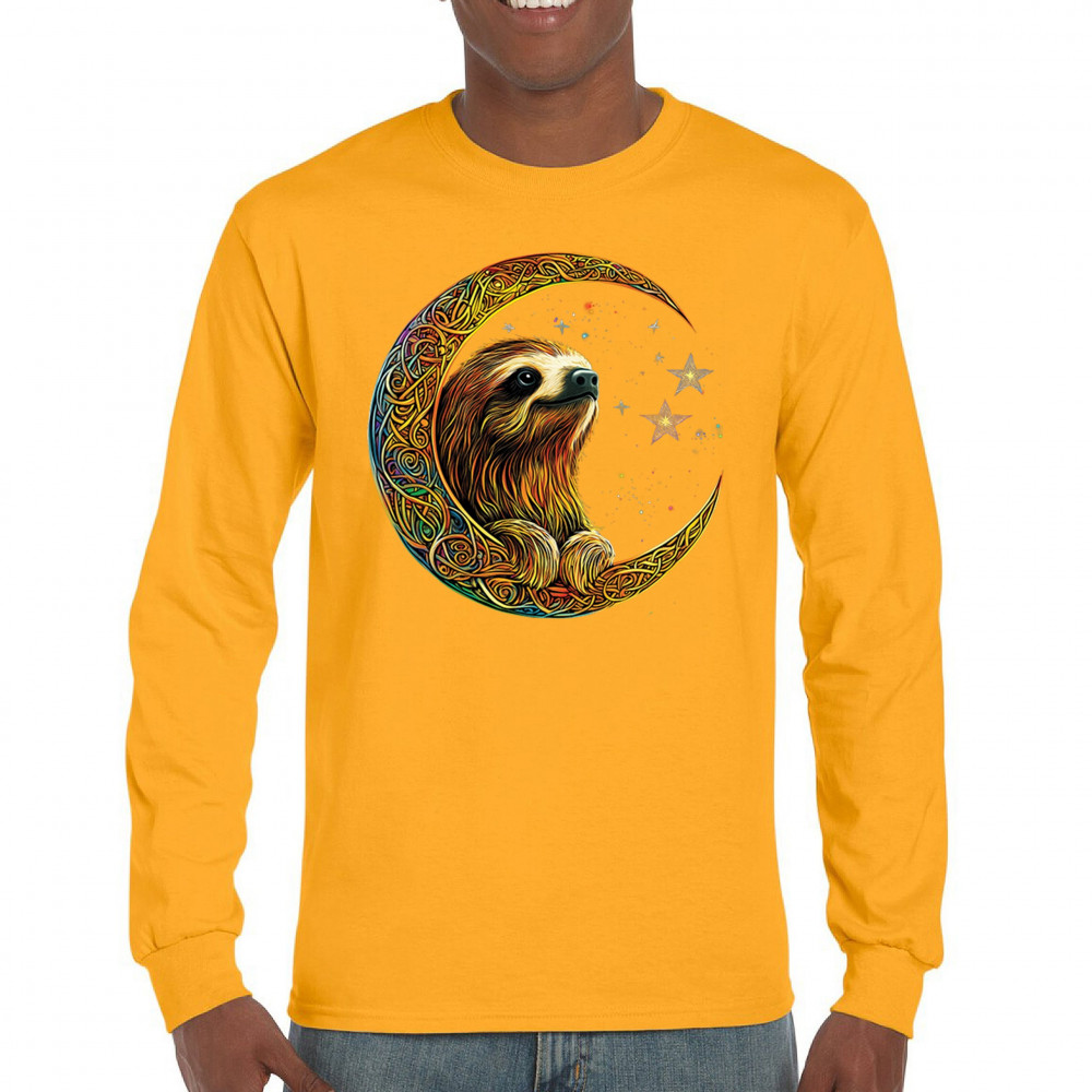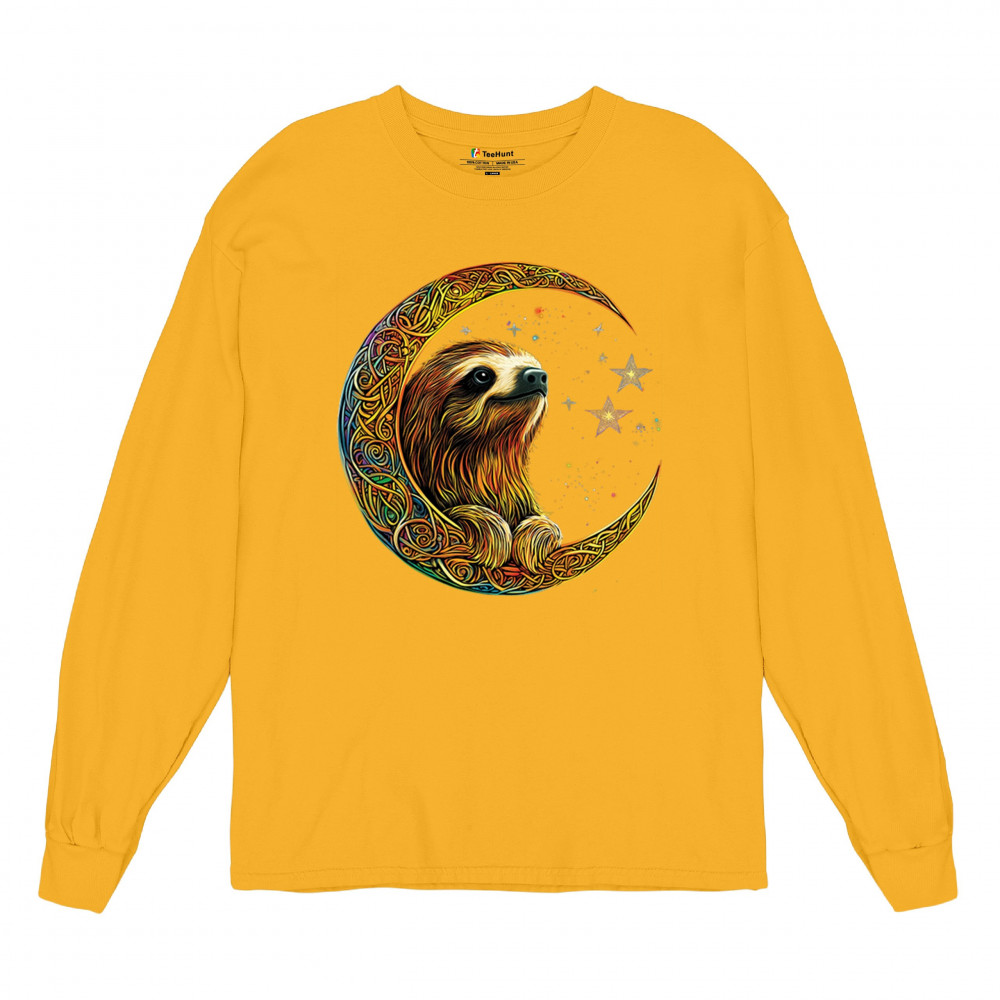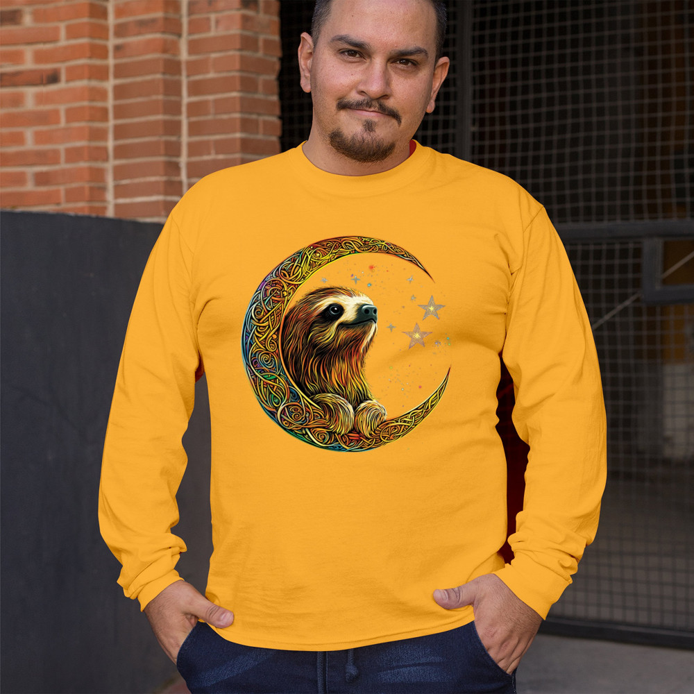 Celebrate peace and presence with this stunning sloth design cradled in a gold Celtic crescent moon. Surrounded by a vibrant starry sky, the image blends jungle whimsy with tribal patterns and mystical vibes. A perfect design for lovers of fantasy animals, mindfulness, and slow living. A beautiful tribute to spiritual stillness and cosmic calm.