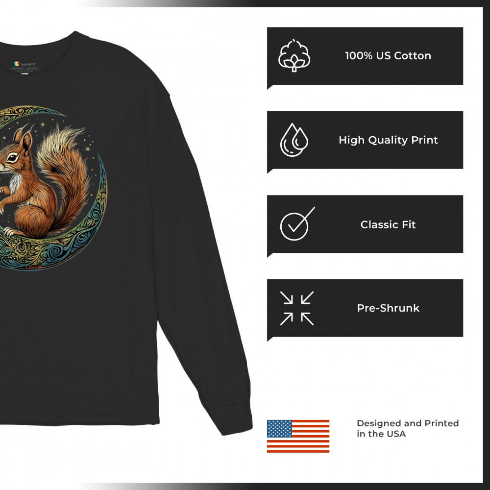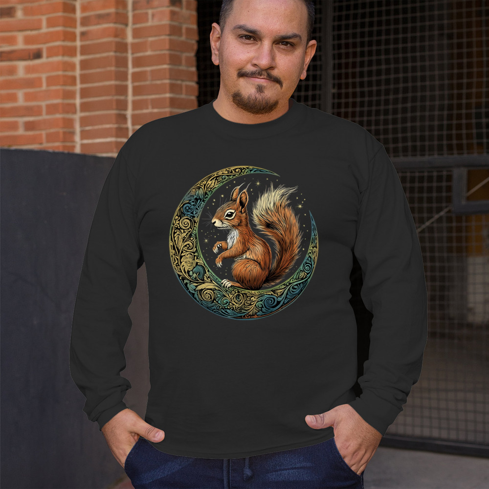 Celebrate agility, awareness, and forest wisdom with this magical red squirrel design. Nestled in a green-gold Celtic crescent moon and backed by a starry cosmic sky, this piece merges natural energy with tribal patterns and celestial wonder. A unique design for animal spirit believers, forest wanderers, and fantasy nature fans.