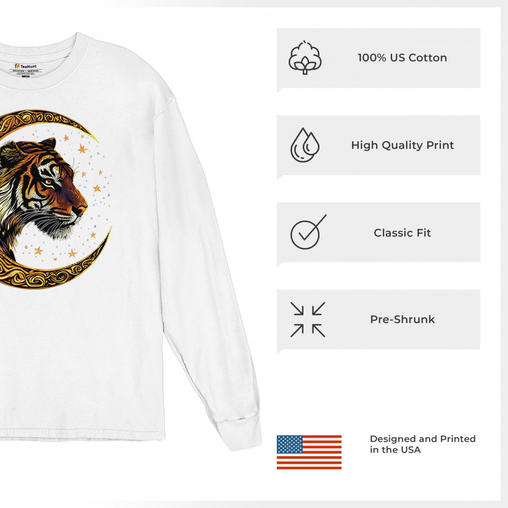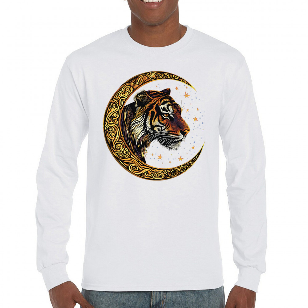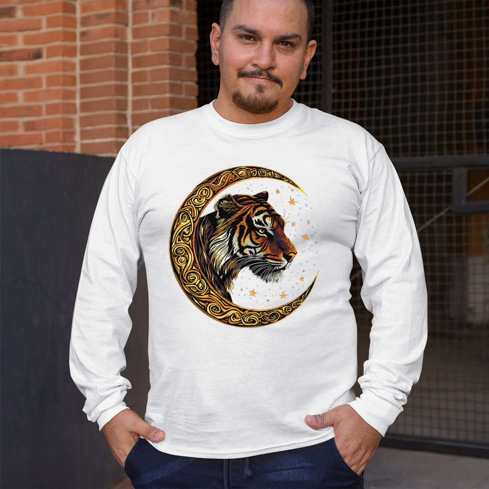 Bold tiger design in Celtic moon with cosmic sky. Symbol of strength, instinct, and jungle mysticism. Great for animal lovers and fantasy fans.