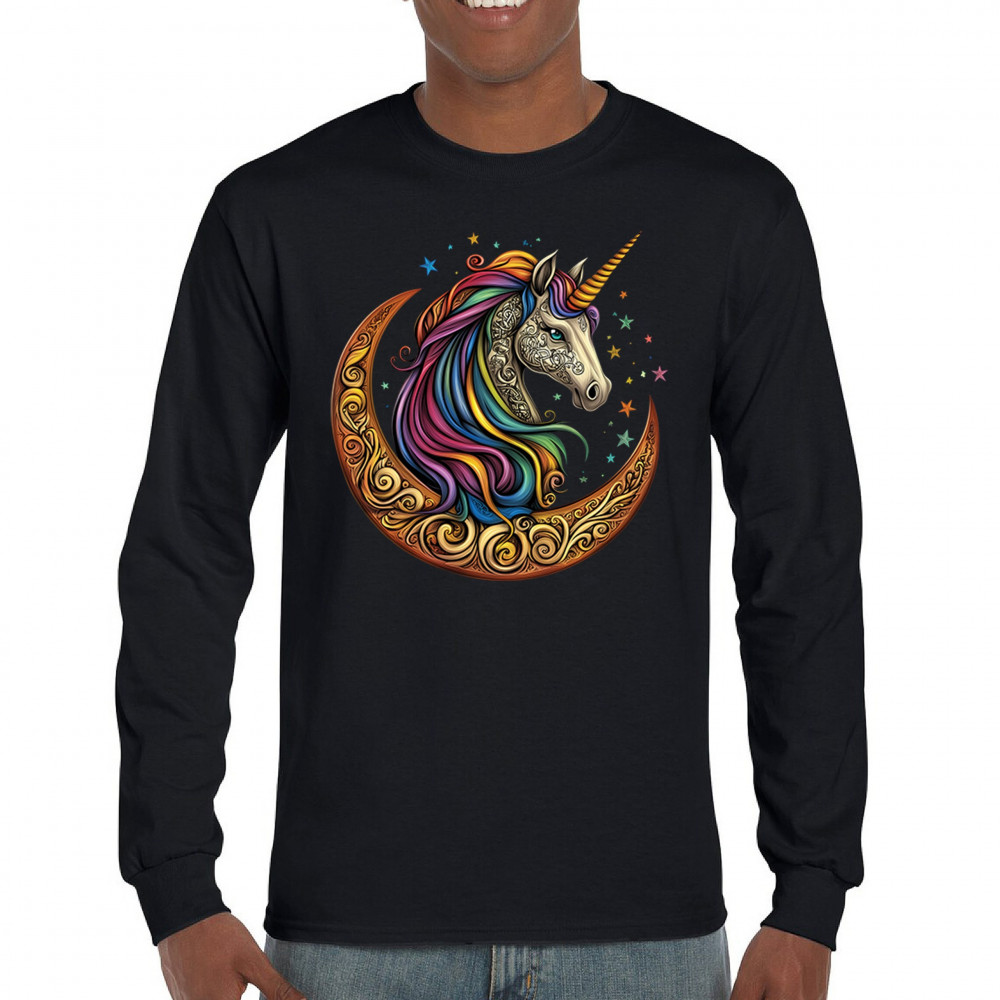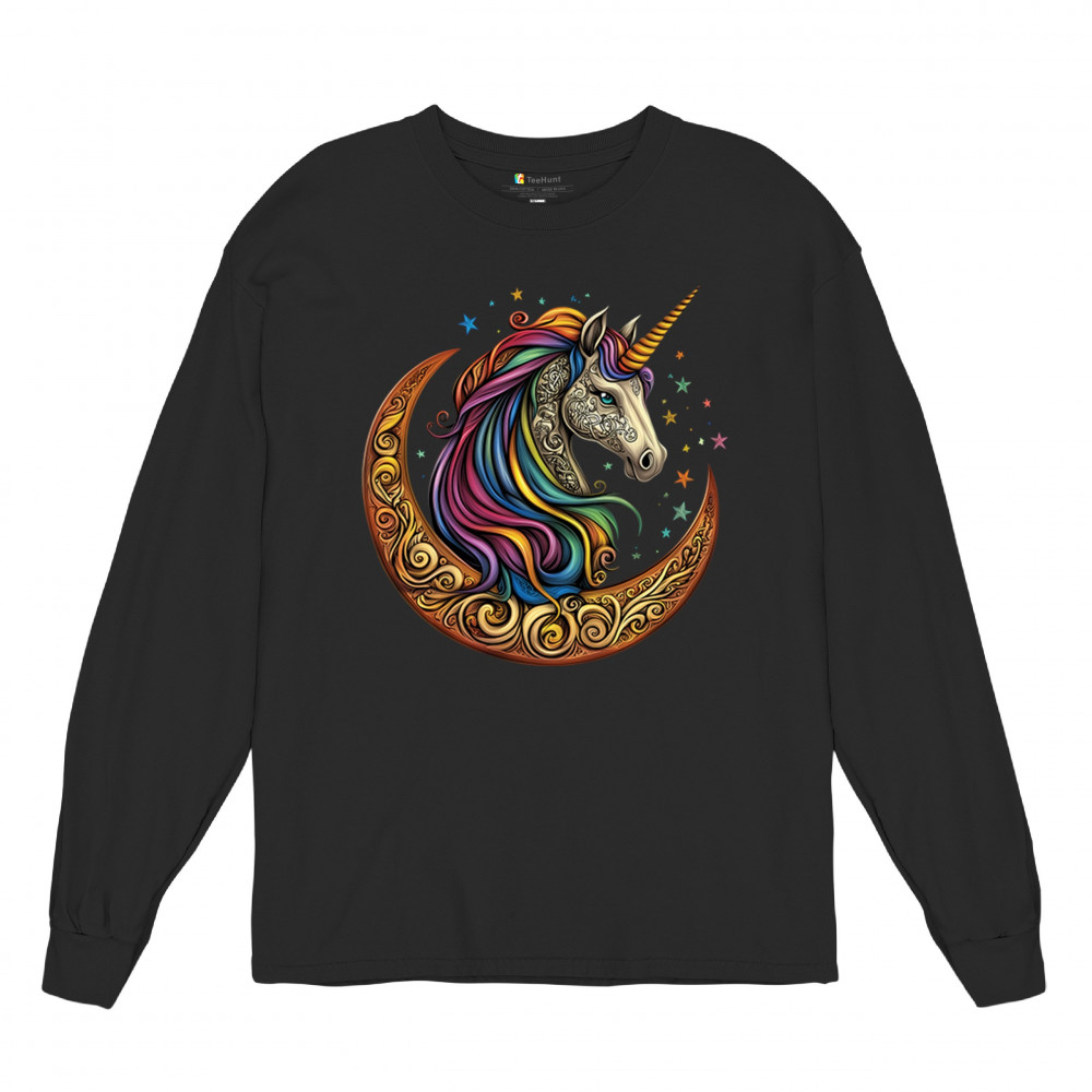 Rainbow-maned unicorn in golden Celtic moon design—perfect for fantasy lovers, dreamers, and unicorn fans who believe in magic and spirit.