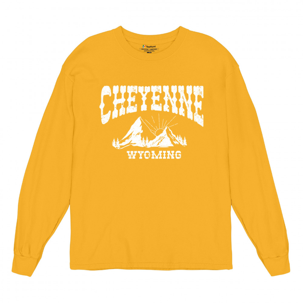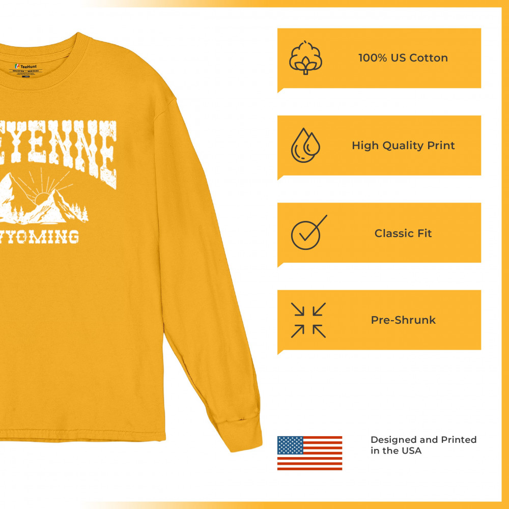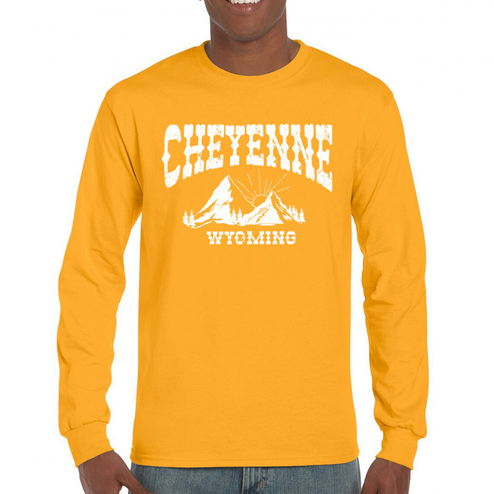 Vintage Cheyenne Wyoming design with mountain sunrise for outdoor lovers and locals. Perfect for travel, hiking, or Western pride.
