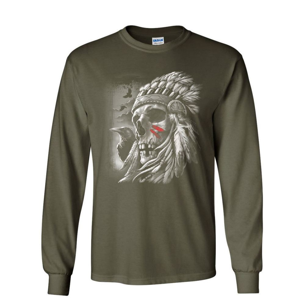 CHIEF SKULL WARBONNET HEADDRESS long sleeve t-shirt native american heritage tee military green