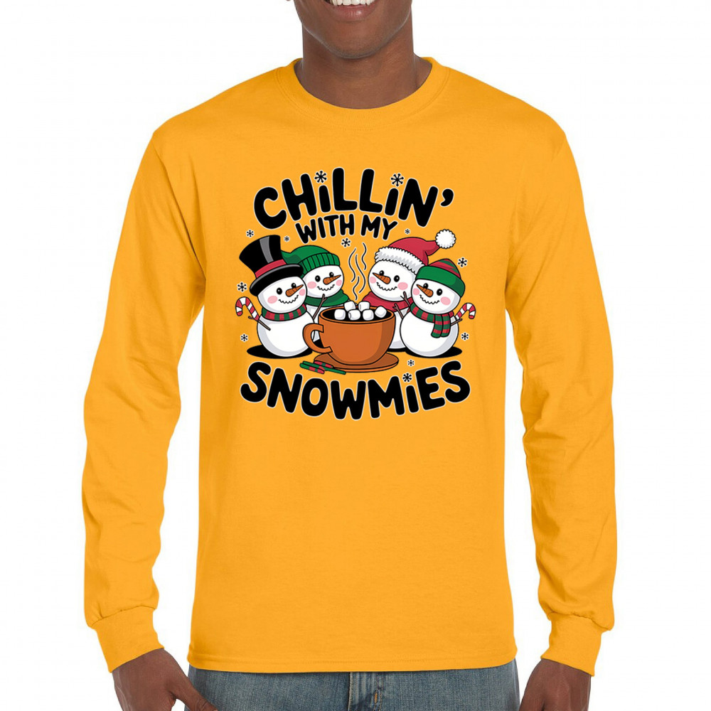 A cute and cheerful winter design showing happy snowmen sharing hot cocoa, perfect for Christmas gatherings, holiday events, seasonal photos, white-elephant gifting, festive family nights, winter celebrations, cozy weekend vibes, and fans of playful holiday humor. A fun graphic for anyone who loves bright and friendly Christmas styles.