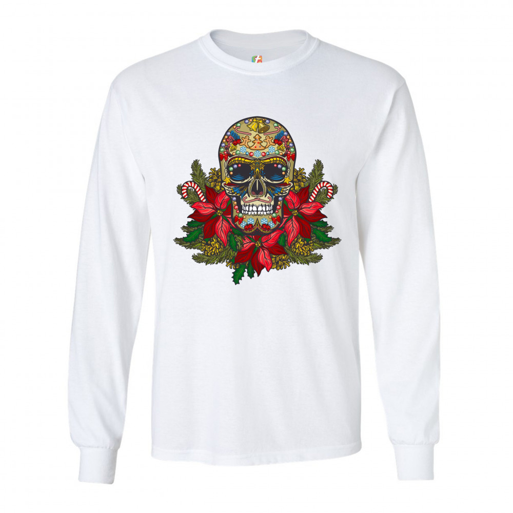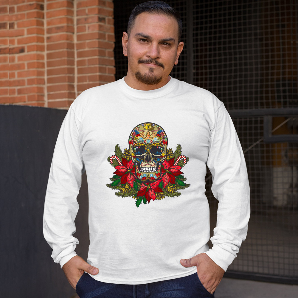 A print featuring a gorgeous sugar skull sitting atop of mistletoe. The skull is decorated with bells, candy canes and gingerbread men dancing around a Christmas tree on the forehead. It has candy canes instead of mustaches and wings underneath the eye so