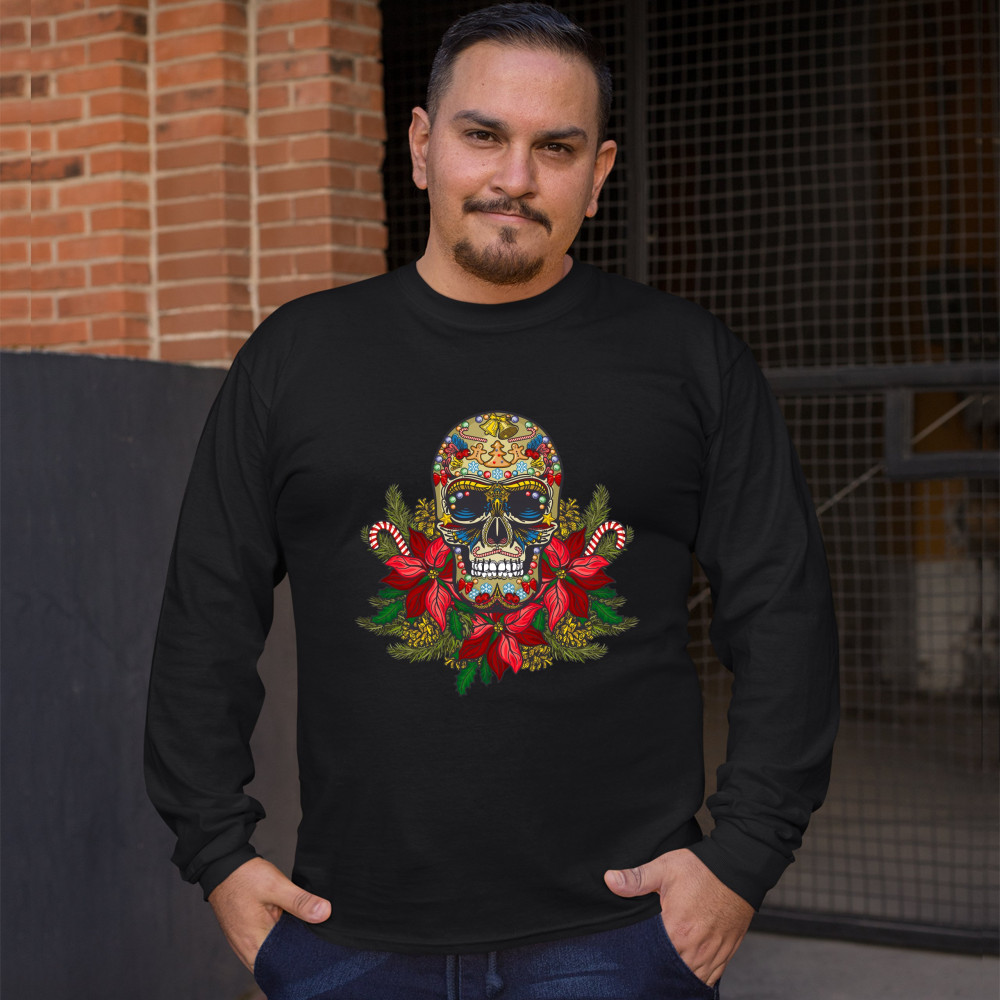 CHRISTMAS CALAVERA long sleeve t-shirt sugar skull holiday spirit mistletoe black
