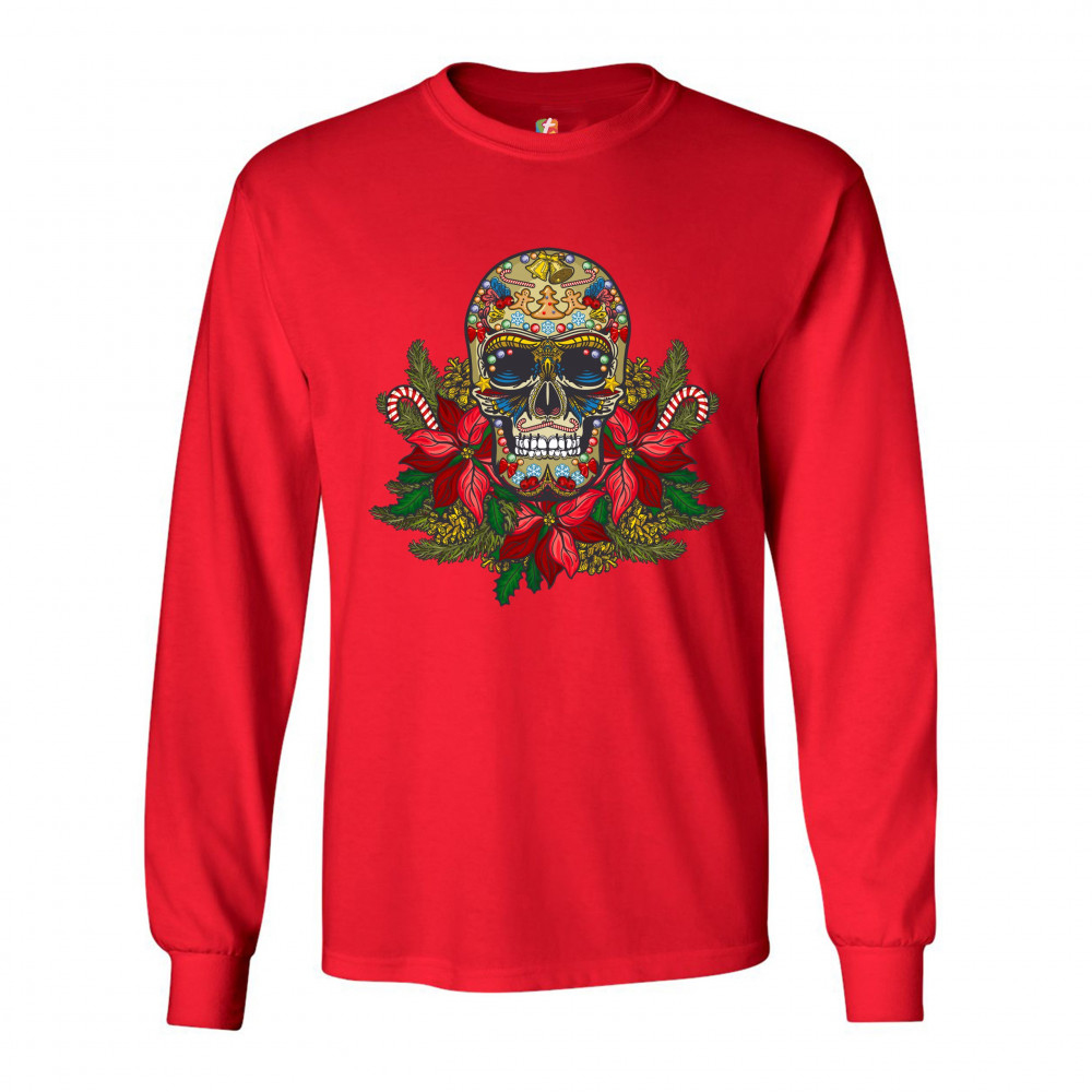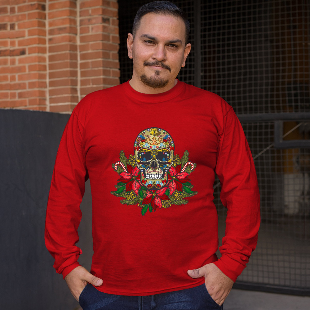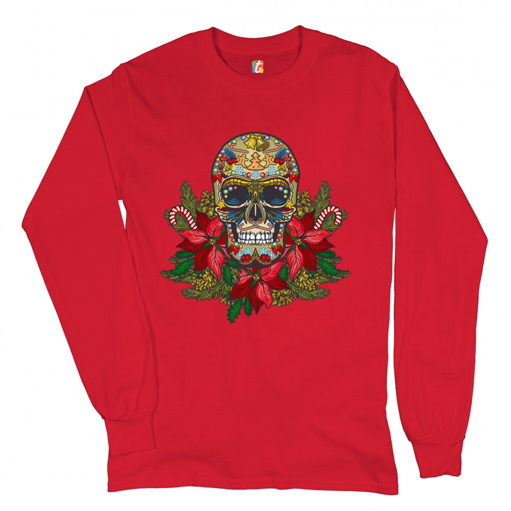 A print featuring a gorgeous sugar skull sitting atop of mistletoe. The skull is decorated with bells, candy canes and gingerbread men dancing around a Christmas tree on the forehead. It has candy canes instead of mustaches and wings underneath the eye so