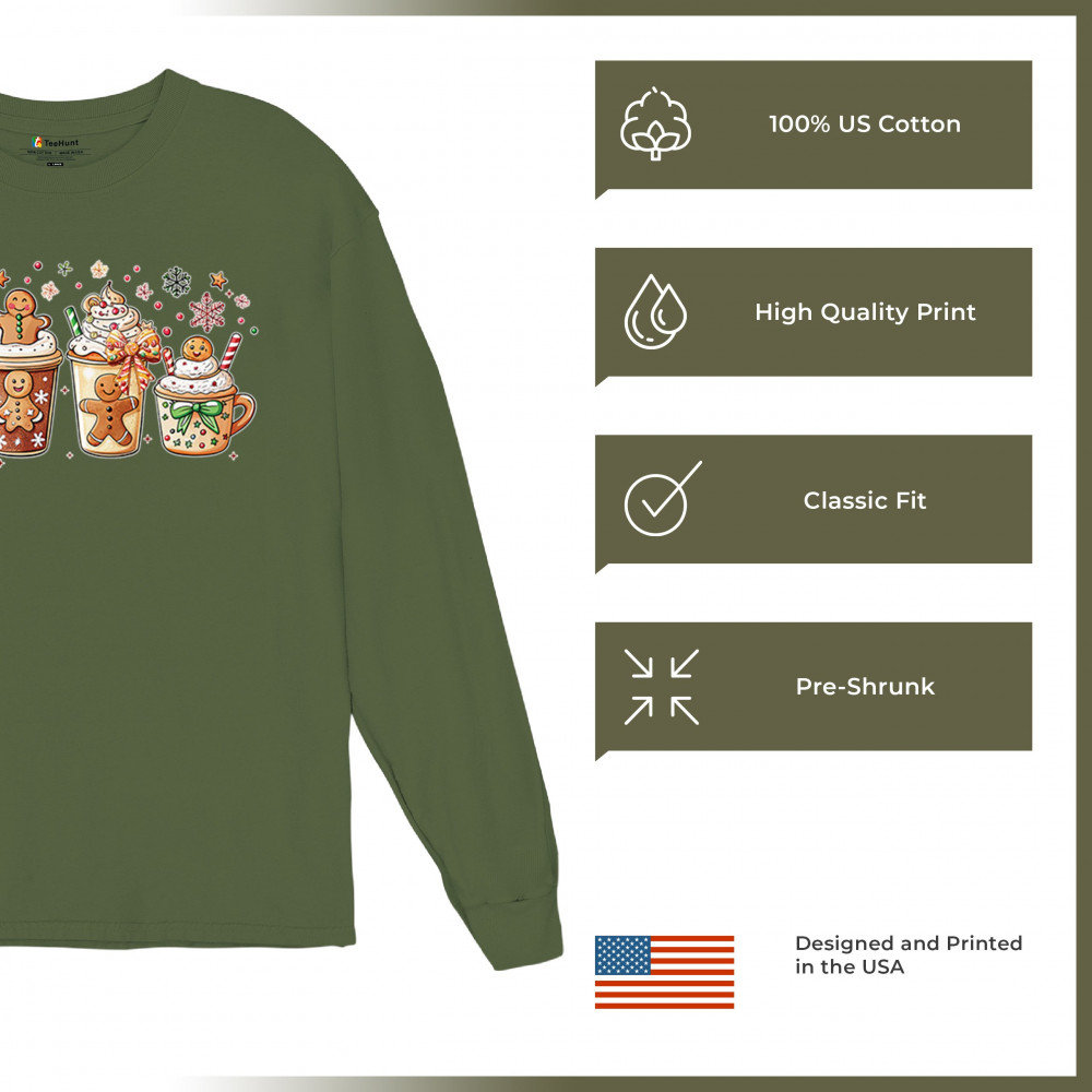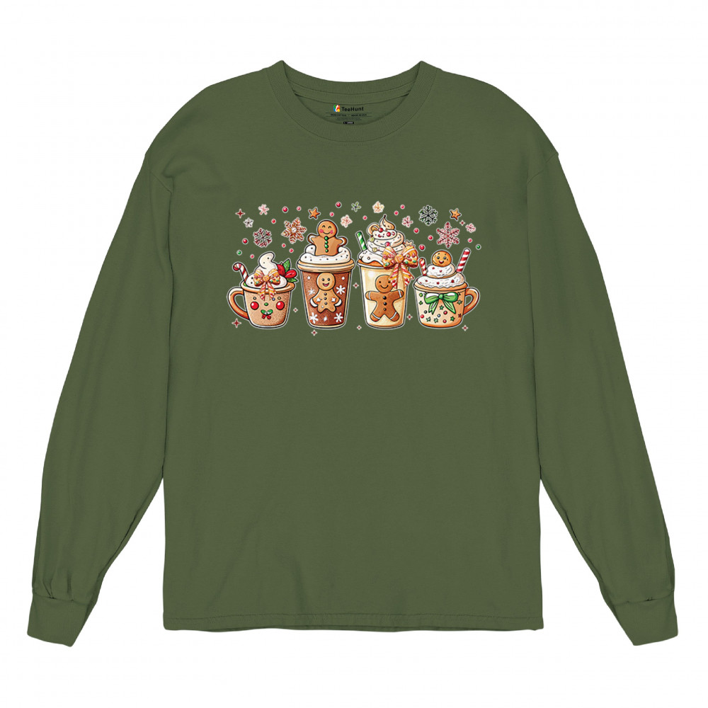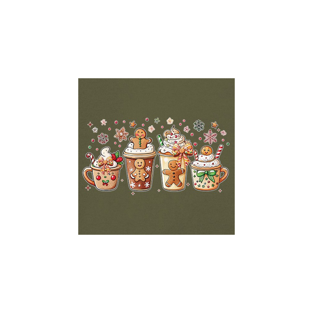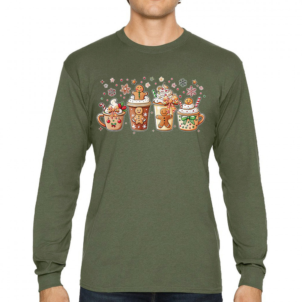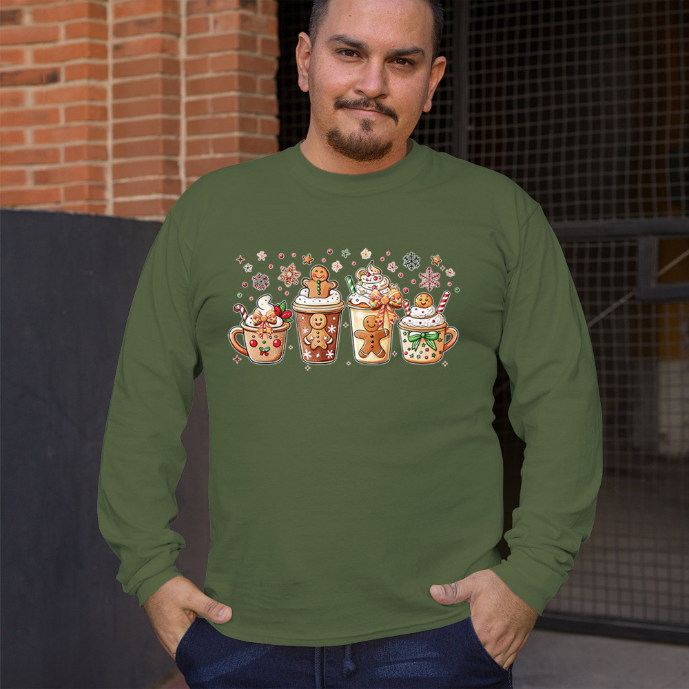This cute Christmas drink design showcases gingerbread mugs, whipped cream, candy canes, sprinkles, and festive decorations for a warm winter aesthetic. Perfect for cocoa lovers, coffee fans, bakers, cozy holiday nights, gift exchanges, Christmas morning vibes, seasonal parties, and anyone who loves adorable dessert-inspired holiday art.