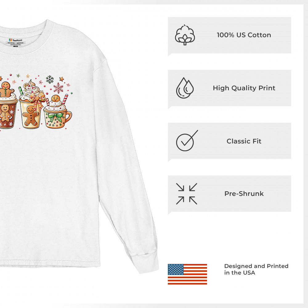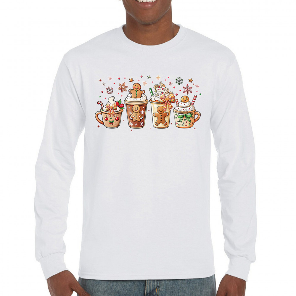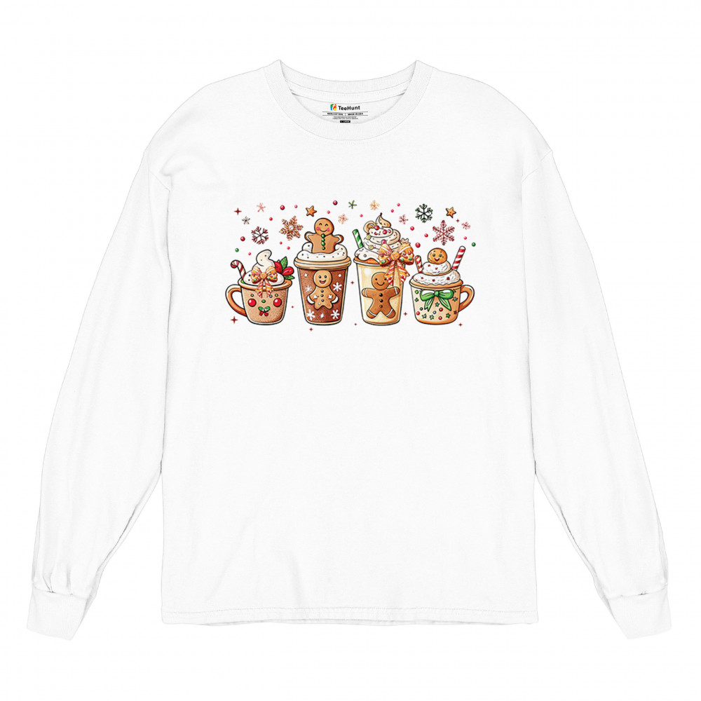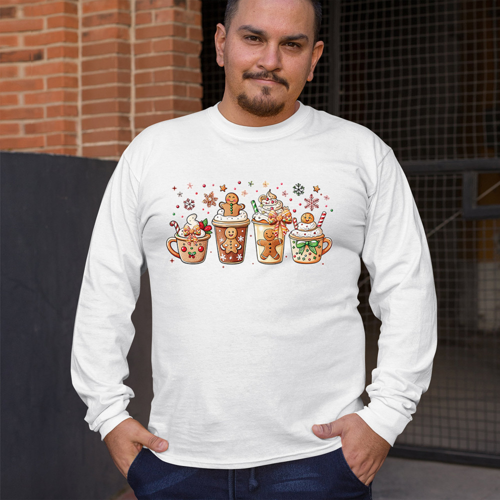 This cute Christmas drink design showcases gingerbread mugs, whipped cream, candy canes, sprinkles, and festive decorations for a warm winter aesthetic. Perfect for cocoa lovers, coffee fans, bakers, cozy holiday nights, gift exchanges, Christmas morning vibes, seasonal parties, and anyone who loves adorable dessert-inspired holiday art.