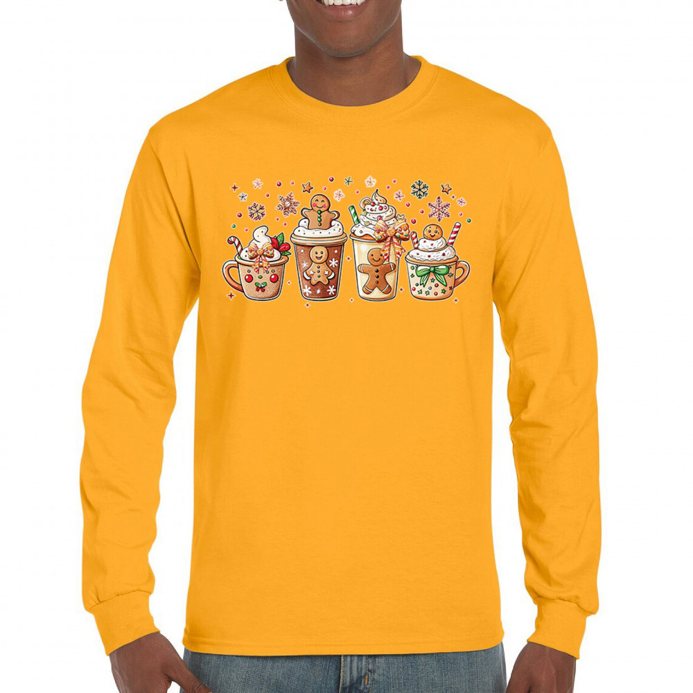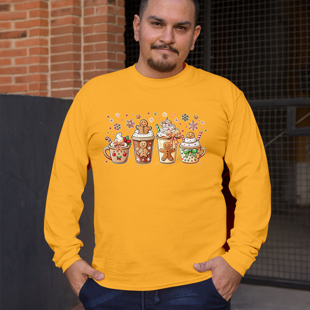 This cute Christmas drink design showcases gingerbread mugs, whipped cream, candy canes, sprinkles, and festive decorations for a warm winter aesthetic. Perfect for cocoa lovers, coffee fans, bakers, cozy holiday nights, gift exchanges, Christmas morning vibes, seasonal parties, and anyone who loves adorable dessert-inspired holiday art.