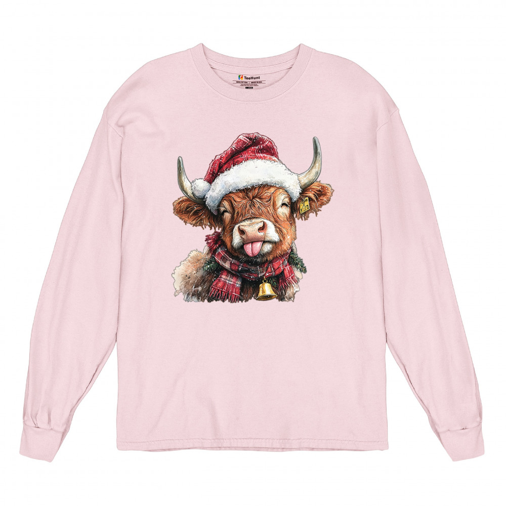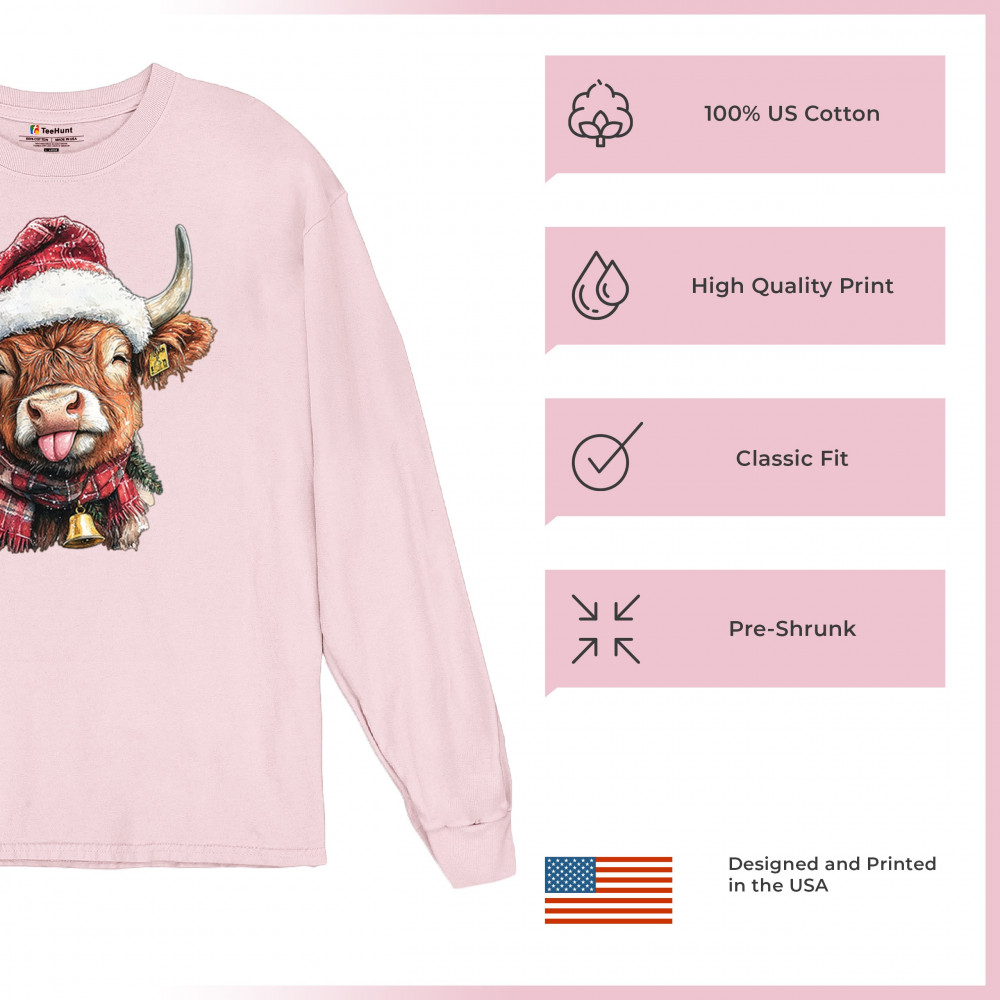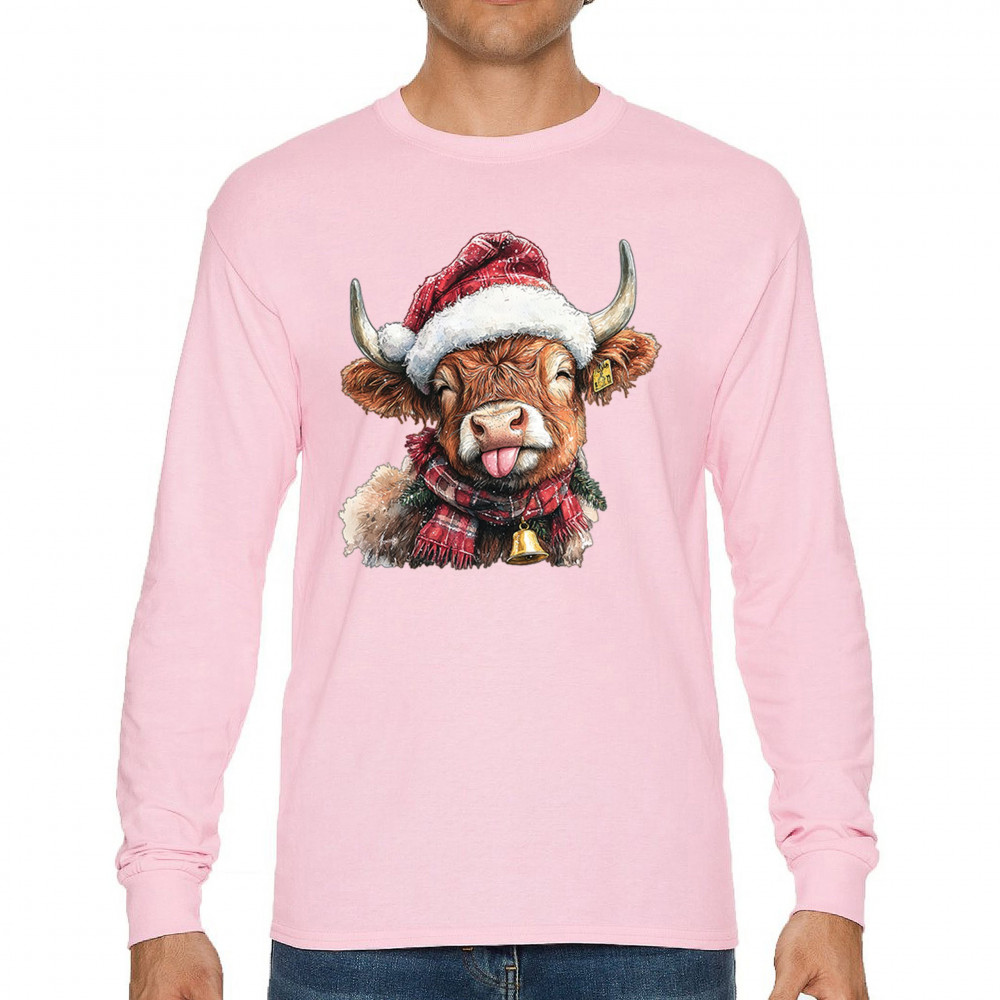 Christmas Highland Cow shirt – rustic holiday design with Santa hat cow, farmhouse holiday humor, country Christmas vibes, and festive livestock art.