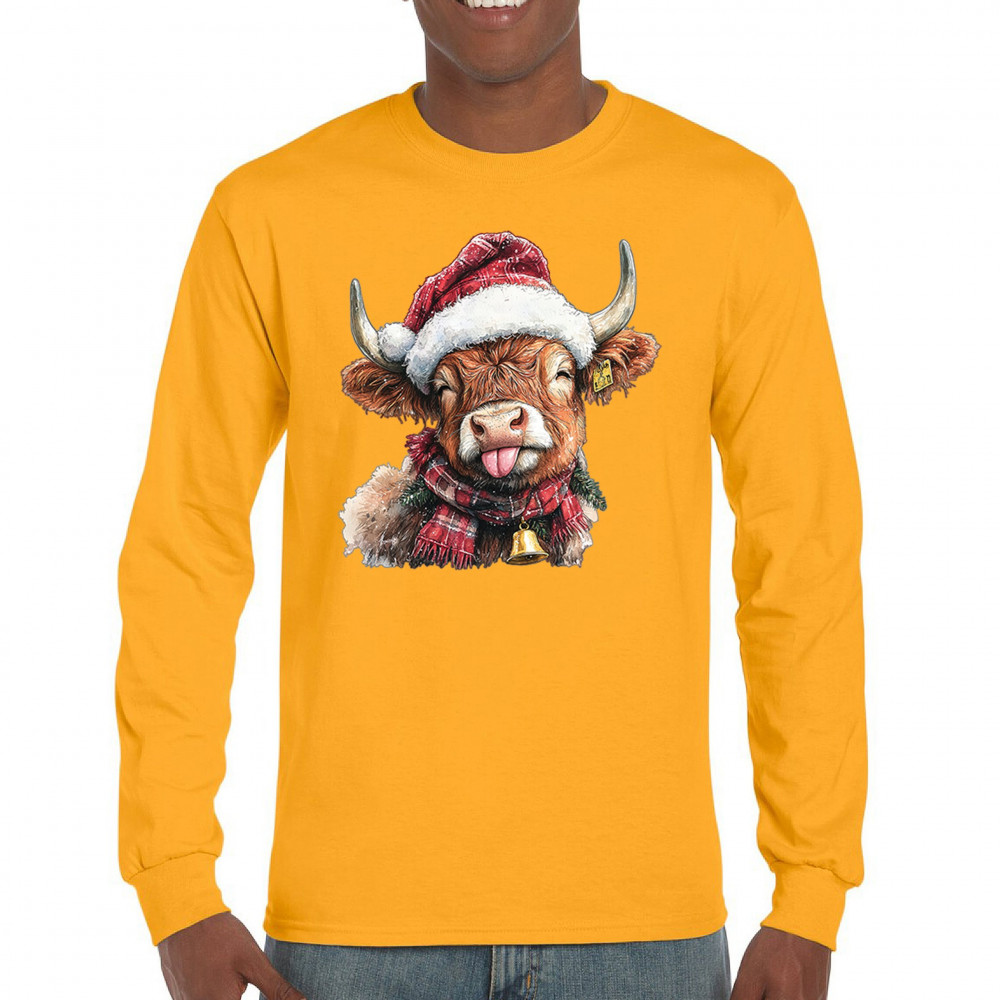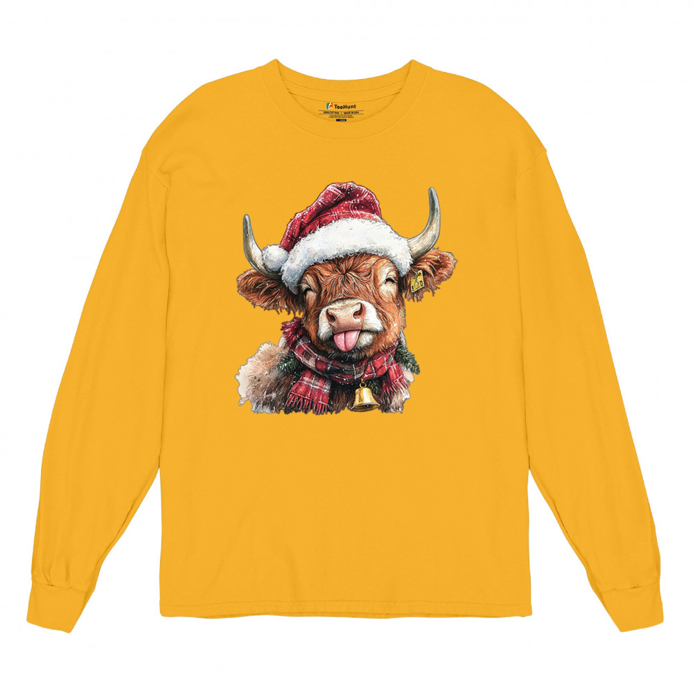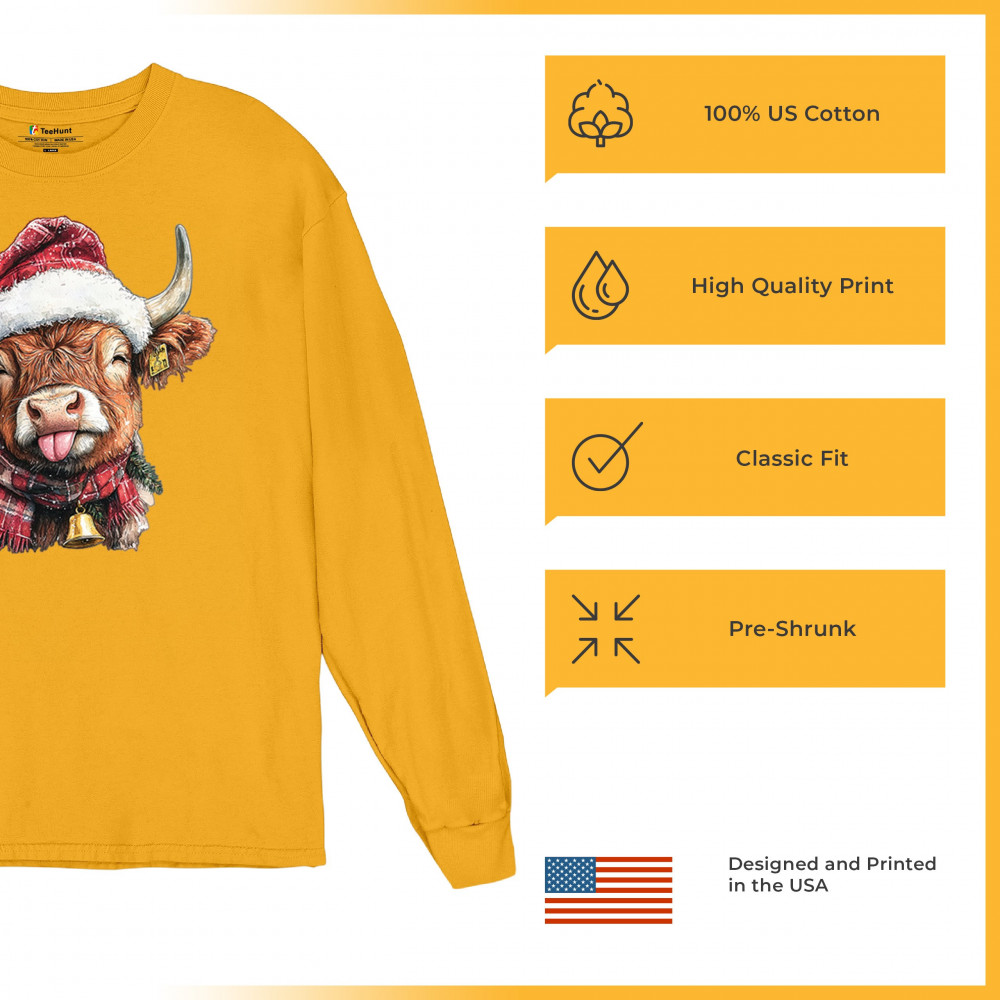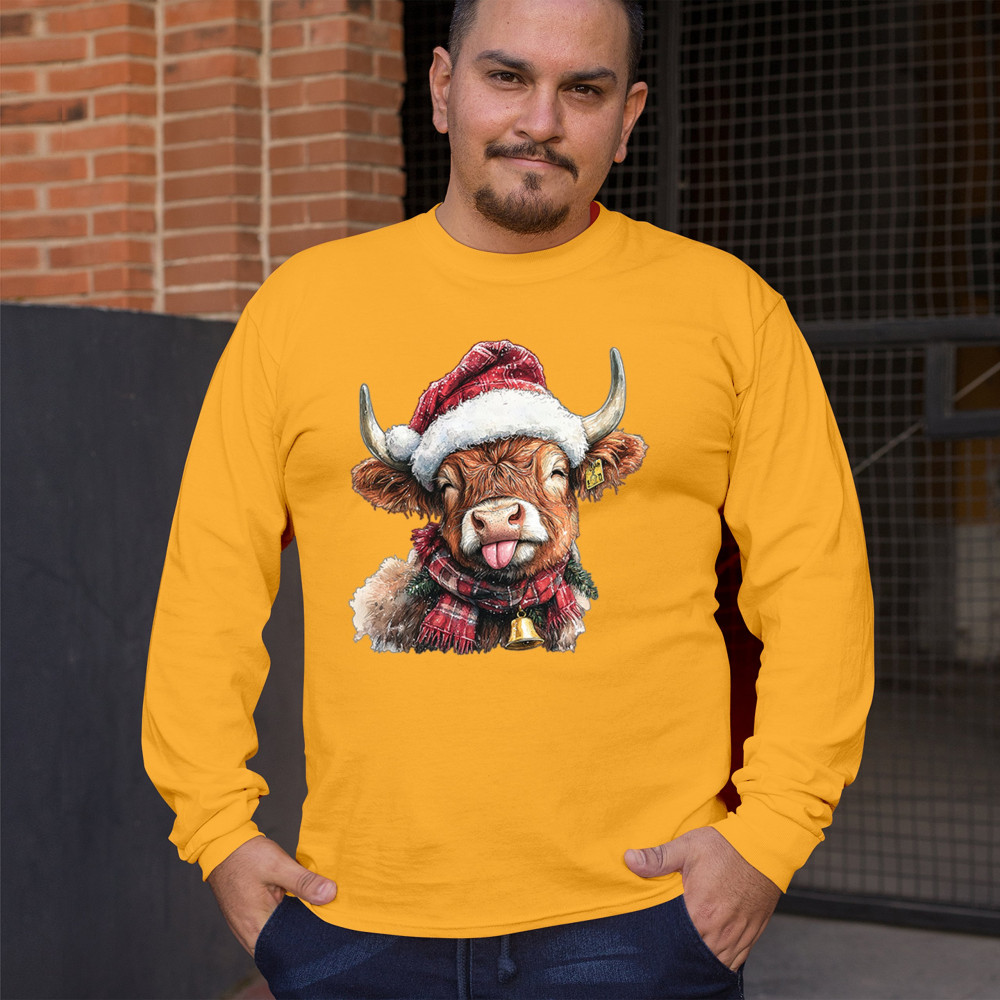Christmas Highland Cow shirt – rustic holiday design with Santa hat cow, farmhouse holiday humor, country Christmas vibes, and festive livestock art.