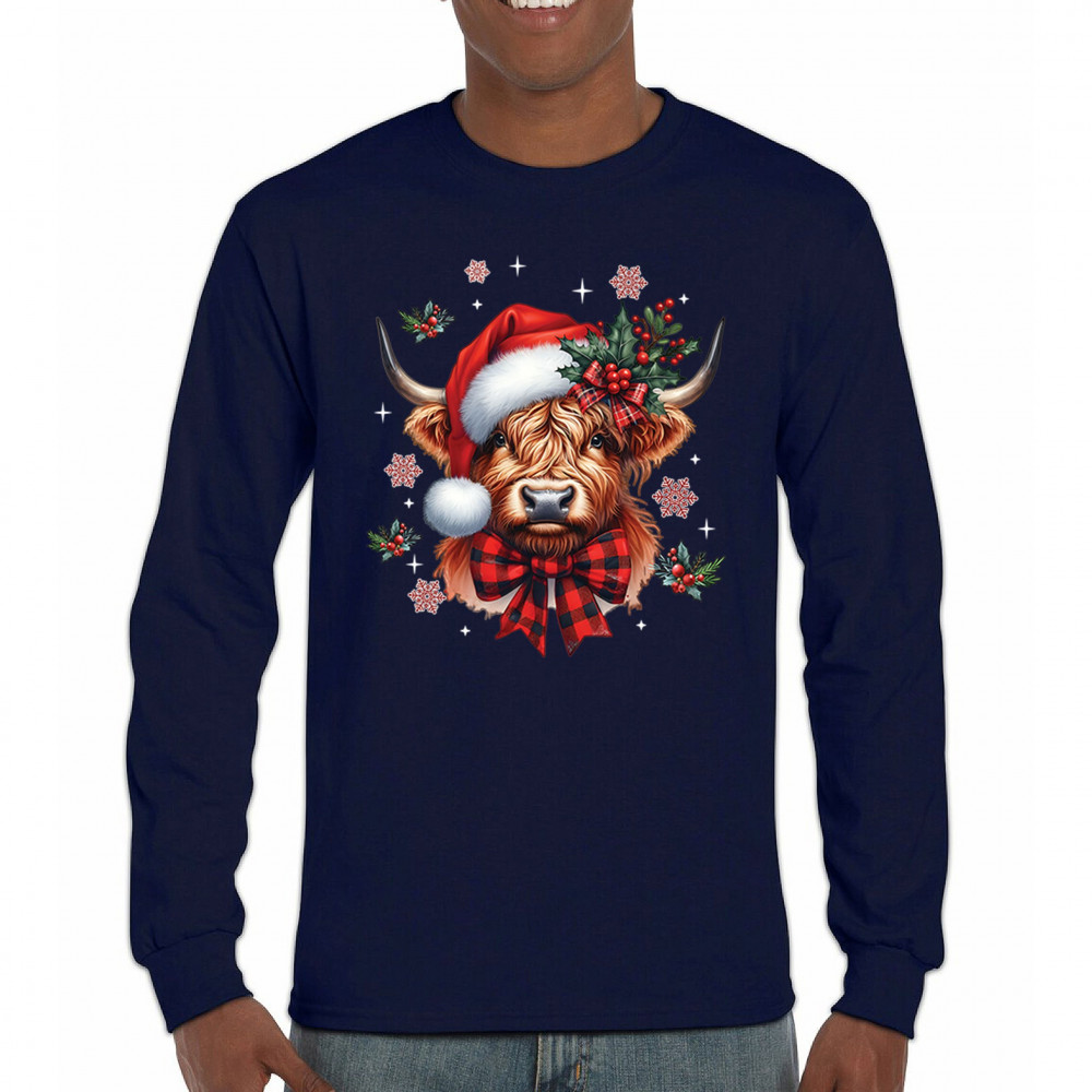 Festive Highland cow Christmas design with Santa hat, plaid bow, holly, and rustic farmhouse holiday charm. Perfect for cozy winter decor.