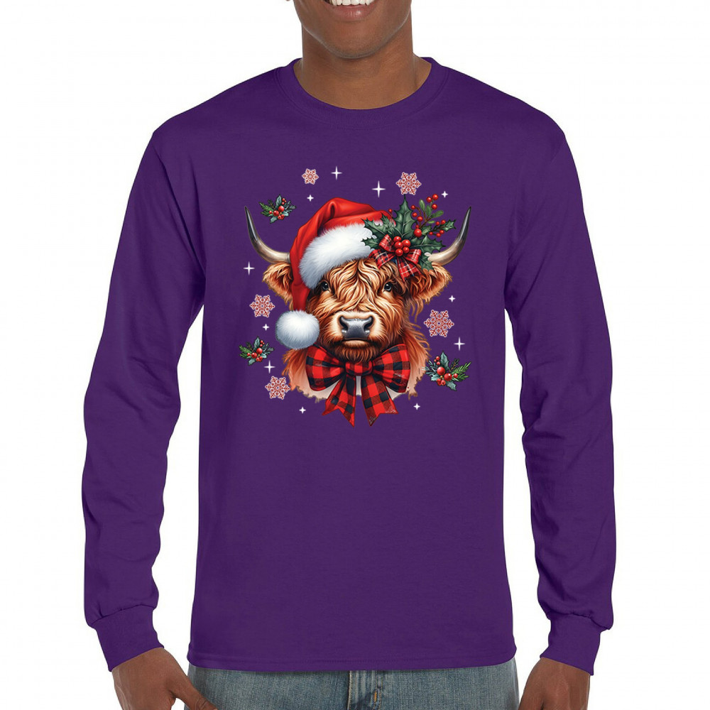 Festive Highland cow Christmas design with Santa hat, plaid bow, holly, and rustic farmhouse holiday charm. Perfect for cozy winter decor.