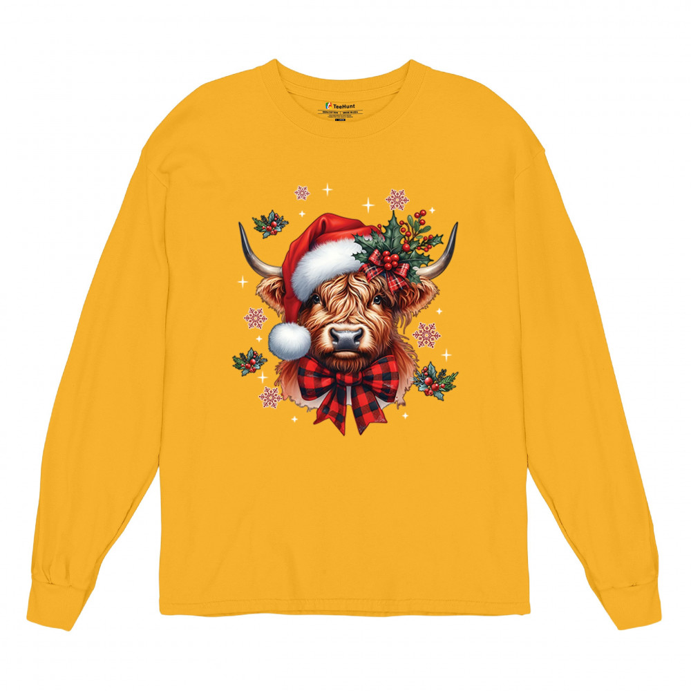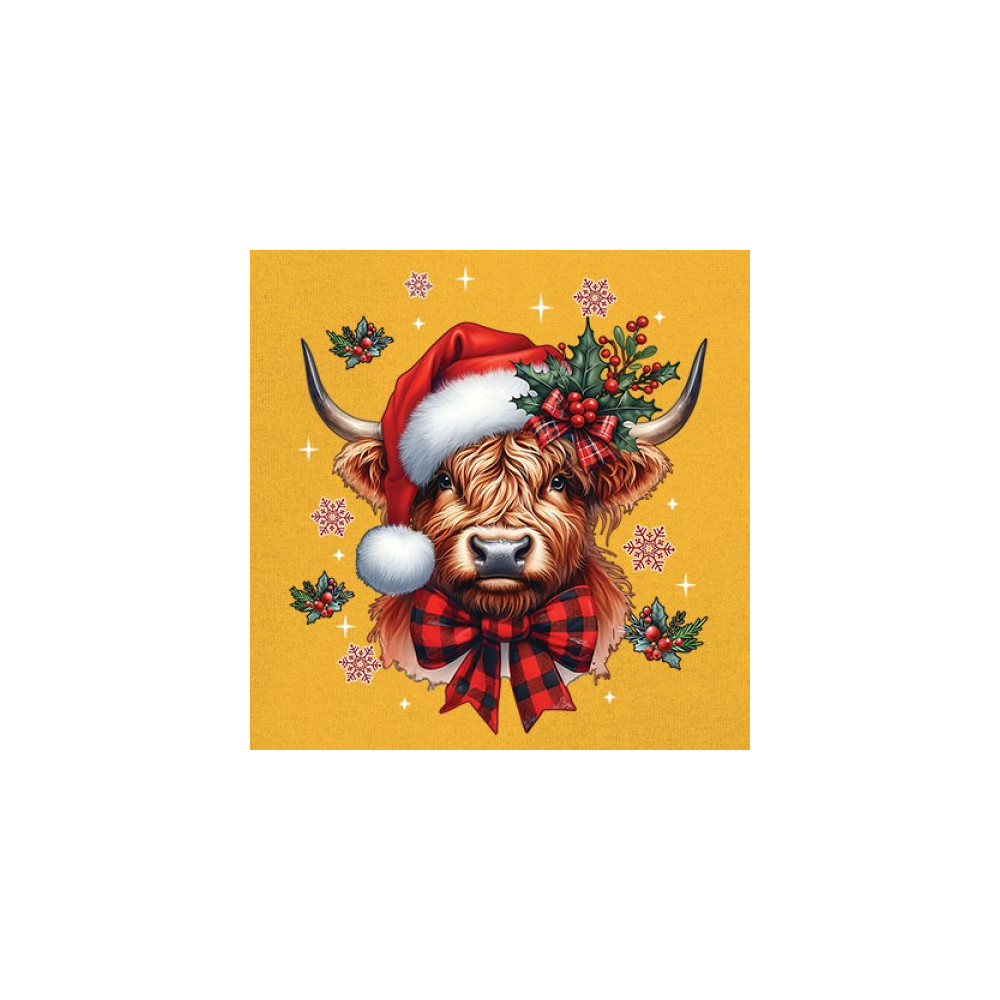 This adorable Highland cow Christmas design blends farmhouse charm, rustic holiday style, and classic winter décor. With a Santa hat, plaid bow, holly, and snowflakes, it delivers warm festive energy that fits perfectly with country décor, woodland themes, cozy farm aesthetics, holiday gifting, and seasonal celebrations. Ideal for fans of cute animals and cheerful Christmas graphics.c