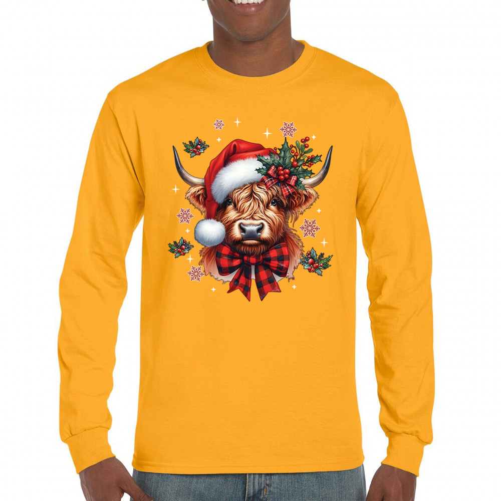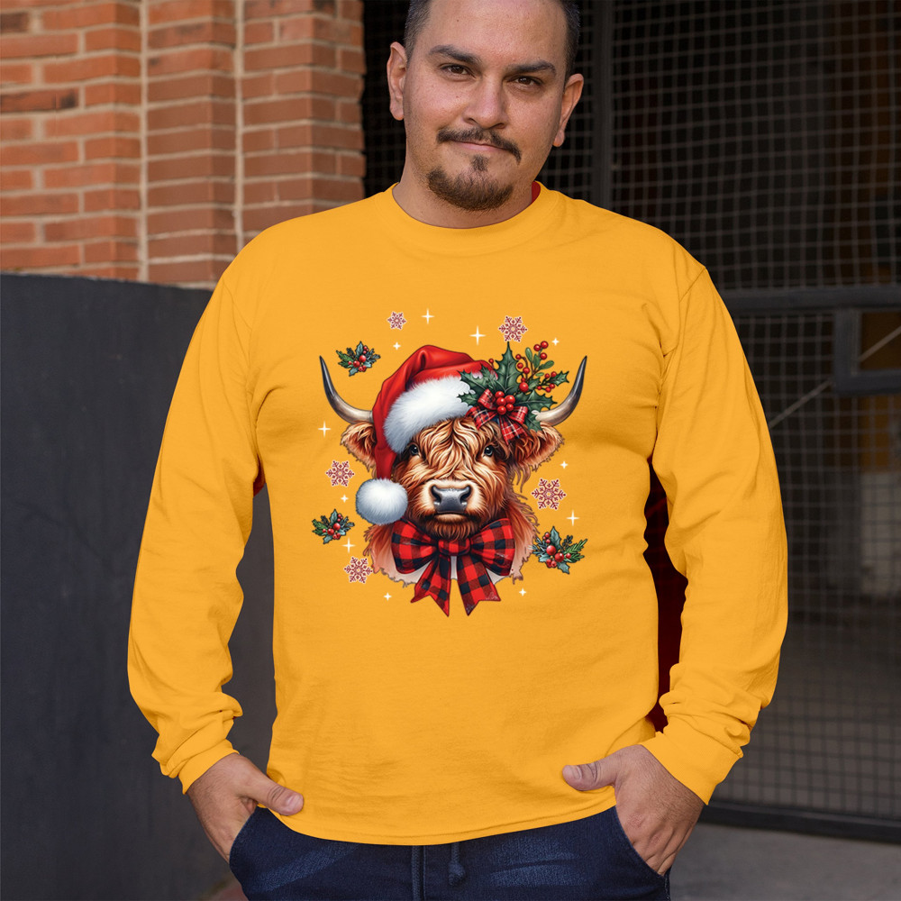 Festive Highland cow Christmas design with Santa hat, plaid bow, holly, and rustic farmhouse holiday charm. Perfect for cozy winter decor.