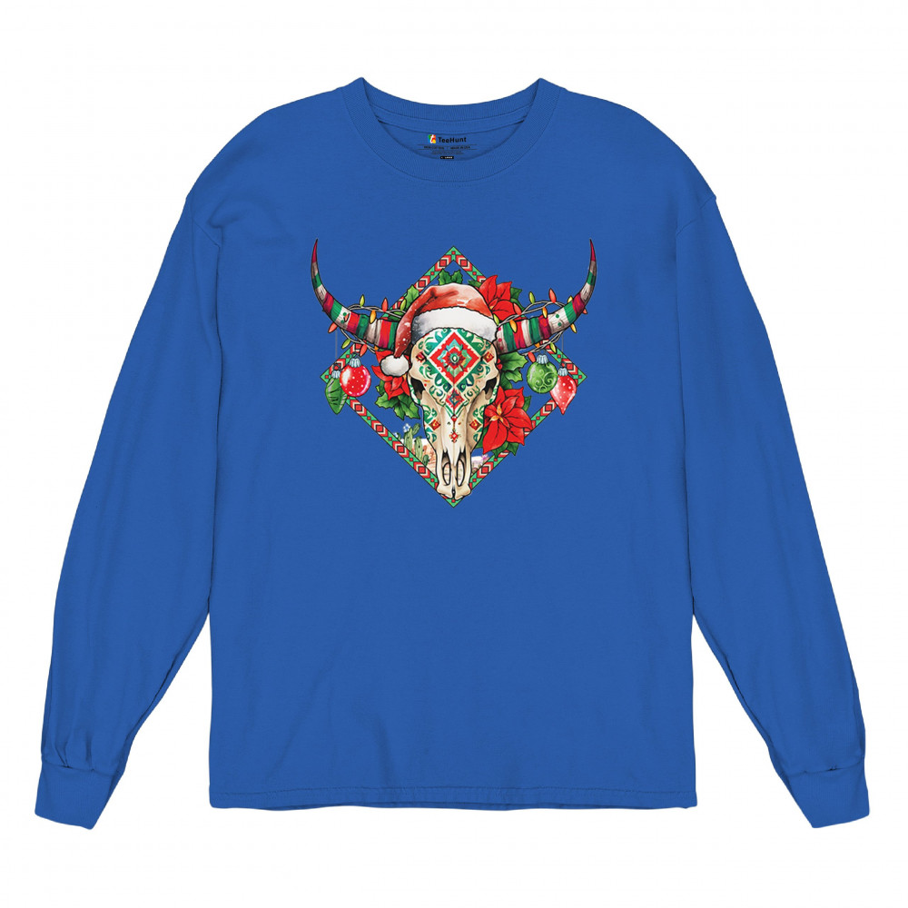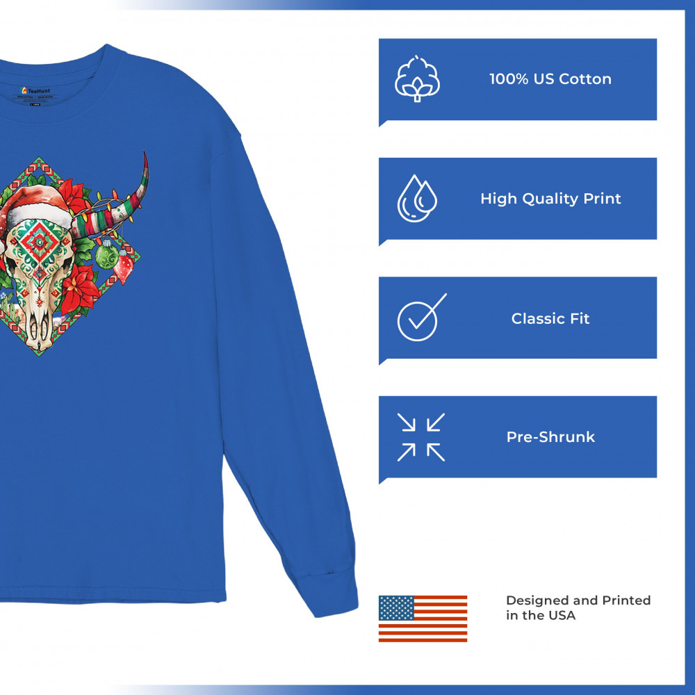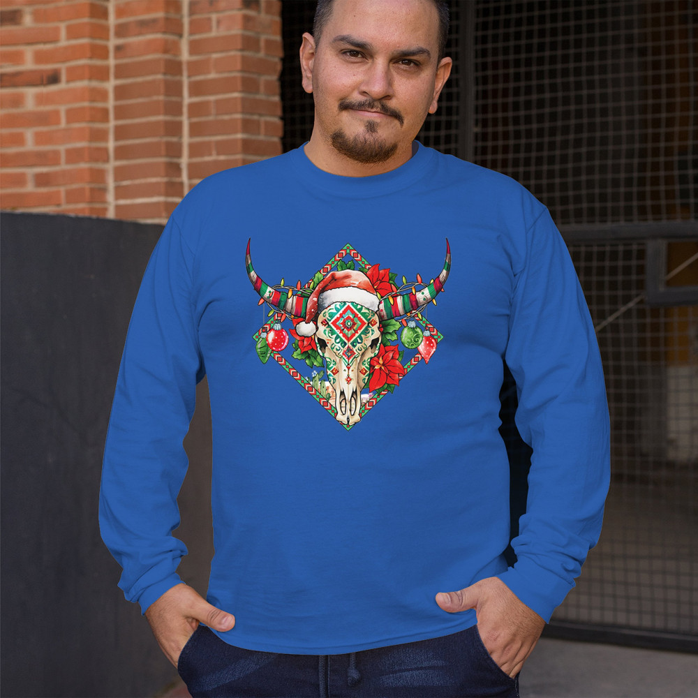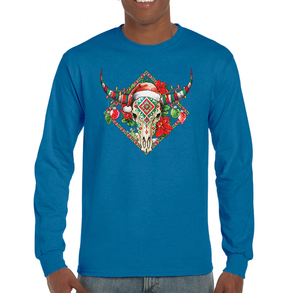 Blend Southwestern charm with holiday cheer! This vibrant skull design with poinsettias and ornaments is perfect for festive parties and unique gifts!