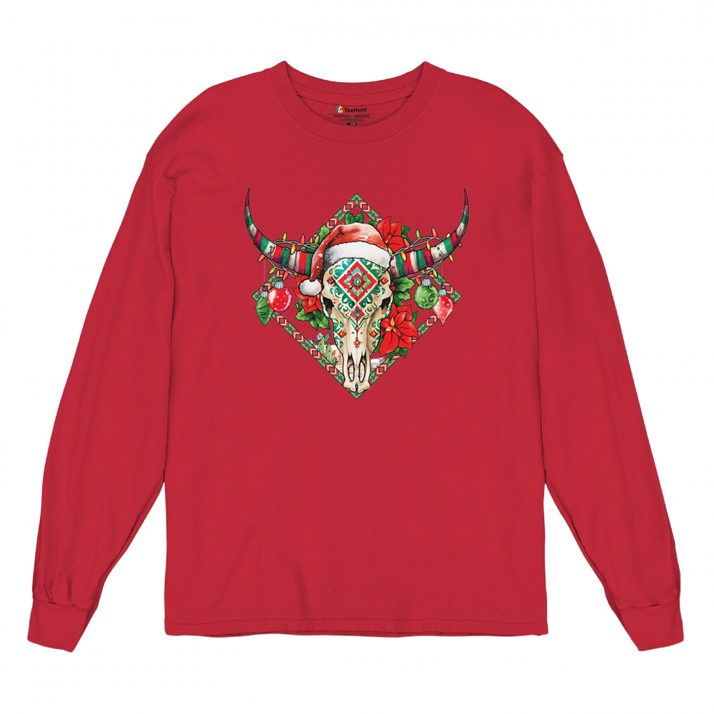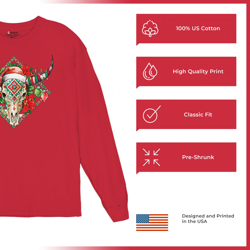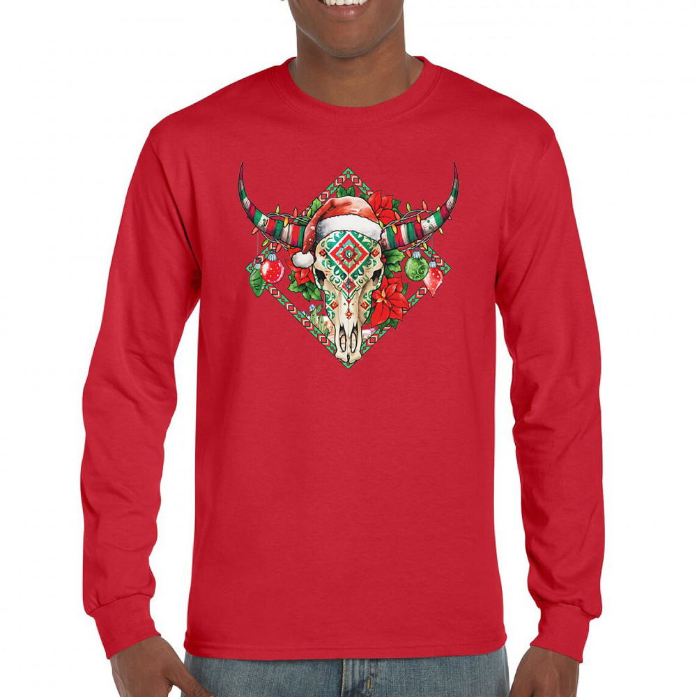 Blend Southwestern charm with holiday cheer! This vibrant skull design with poinsettias and ornaments is perfect for festive parties and unique gifts!