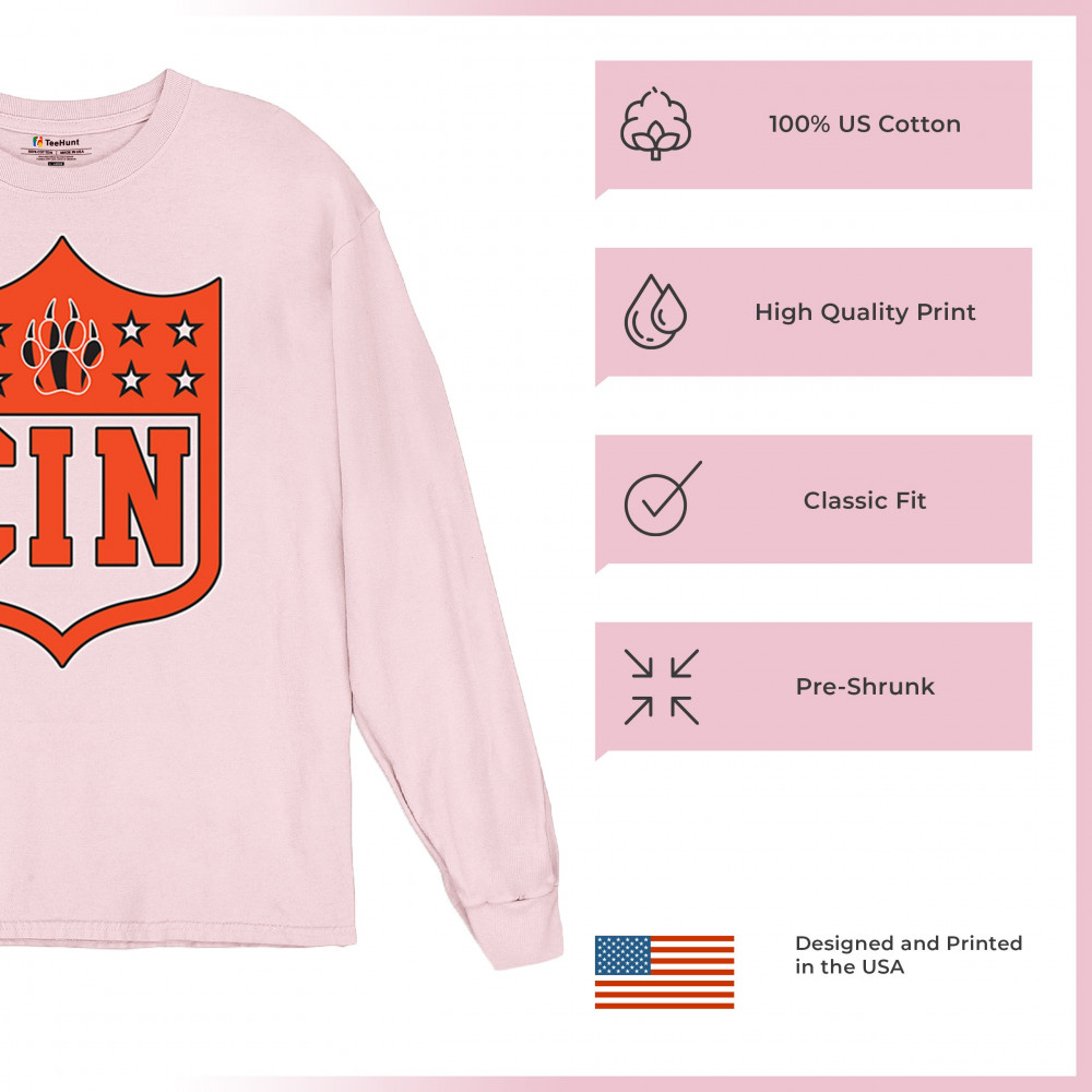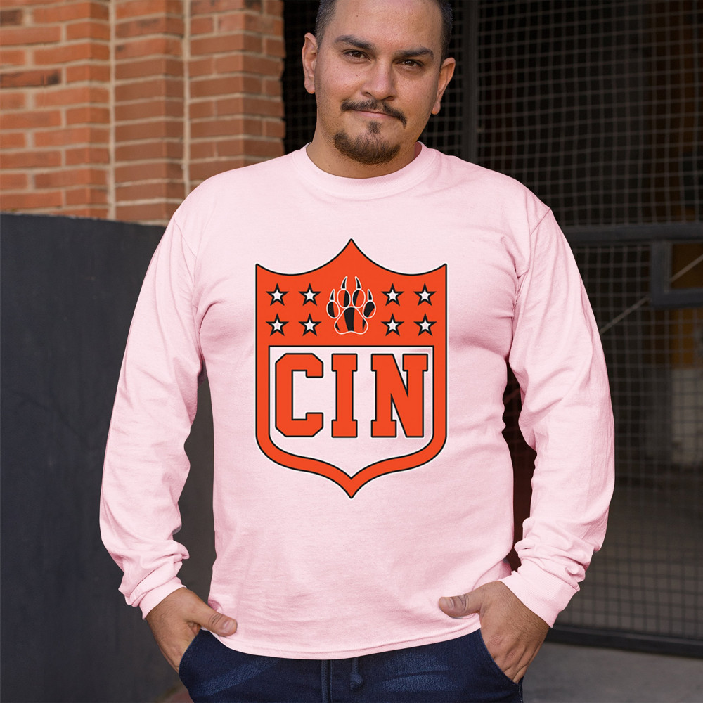 Bold CIN paw shield for Cincinnati football fans. Retro crest style, underdog spirit, and vintage game day gear for true Cincinnati grit.