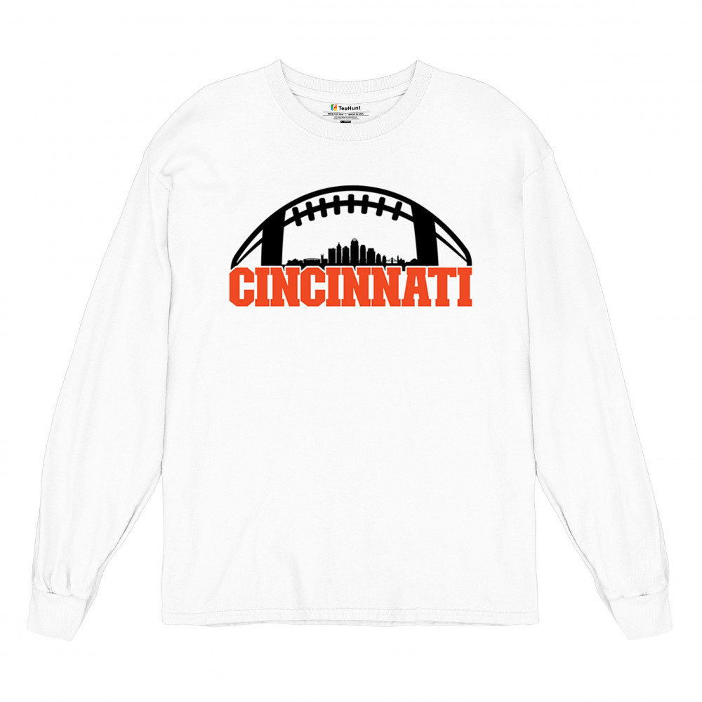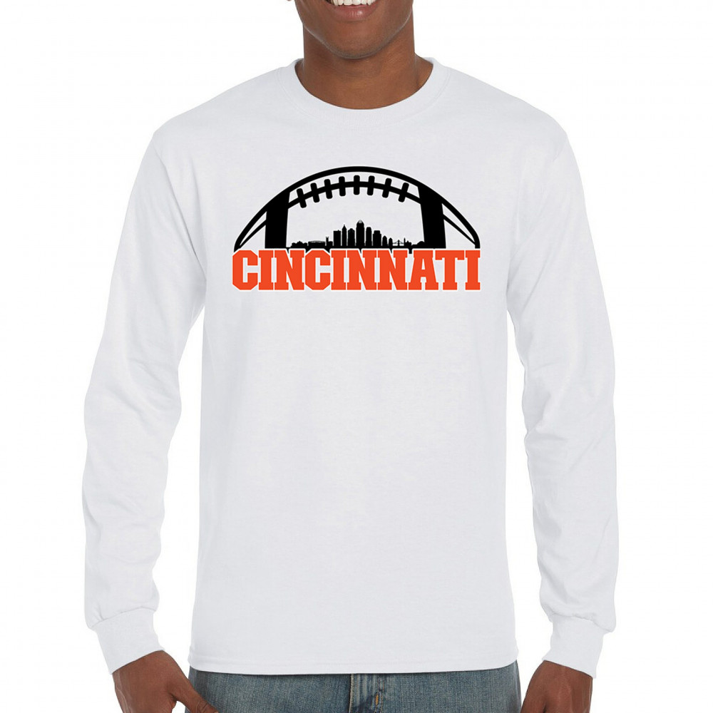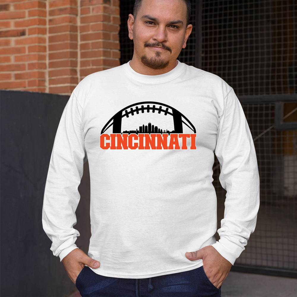Celebrate Cincinnati and football with this bold skyline design under a football arch. Perfect for fans, tailgates, and game days!