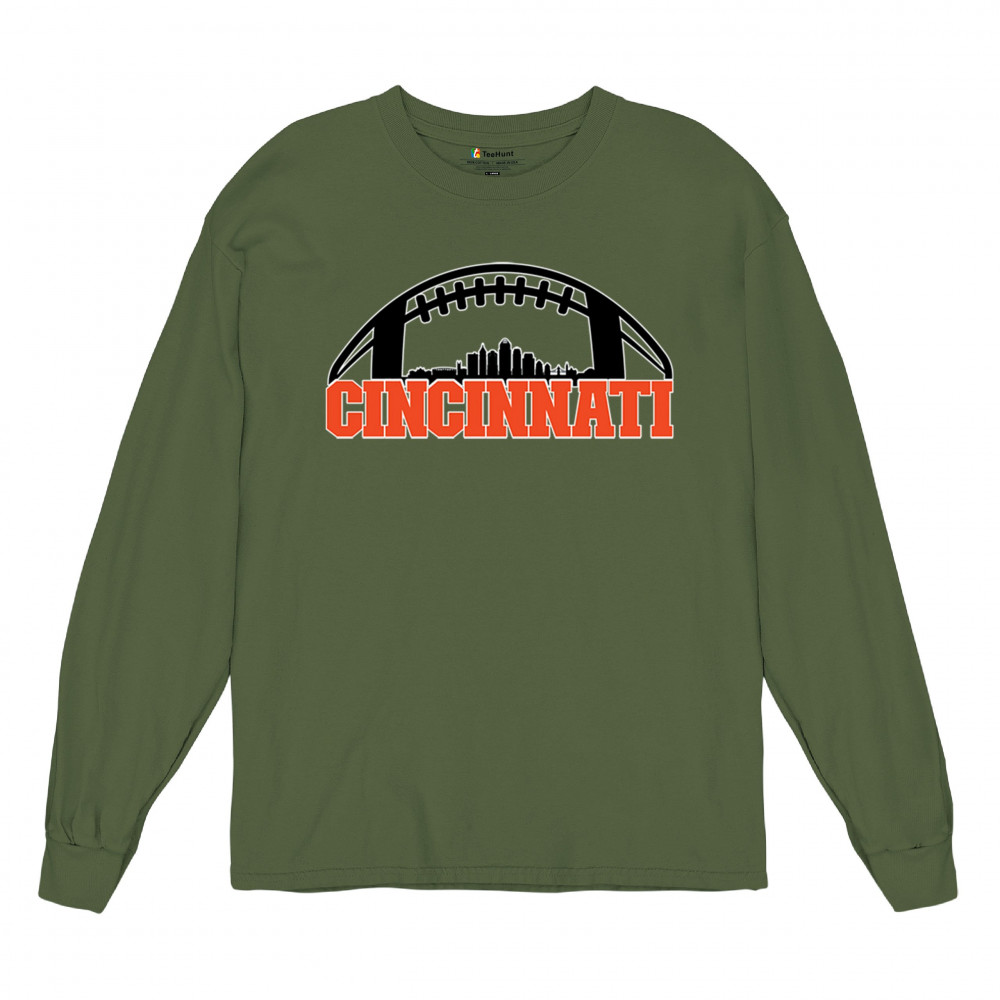Discover the perfect blend of football passion and Cincinnati pride with this eye-catching design. Featuring the Queen City skyline under a bold football arch, this graphic is ideal for fans cheering on their team or celebrating their love for the city. Whether at a tailgate, game, or casual outing, this design lets you show your loyalty in style. A thoughtful gift for Cincinnati football enthusiasts!
