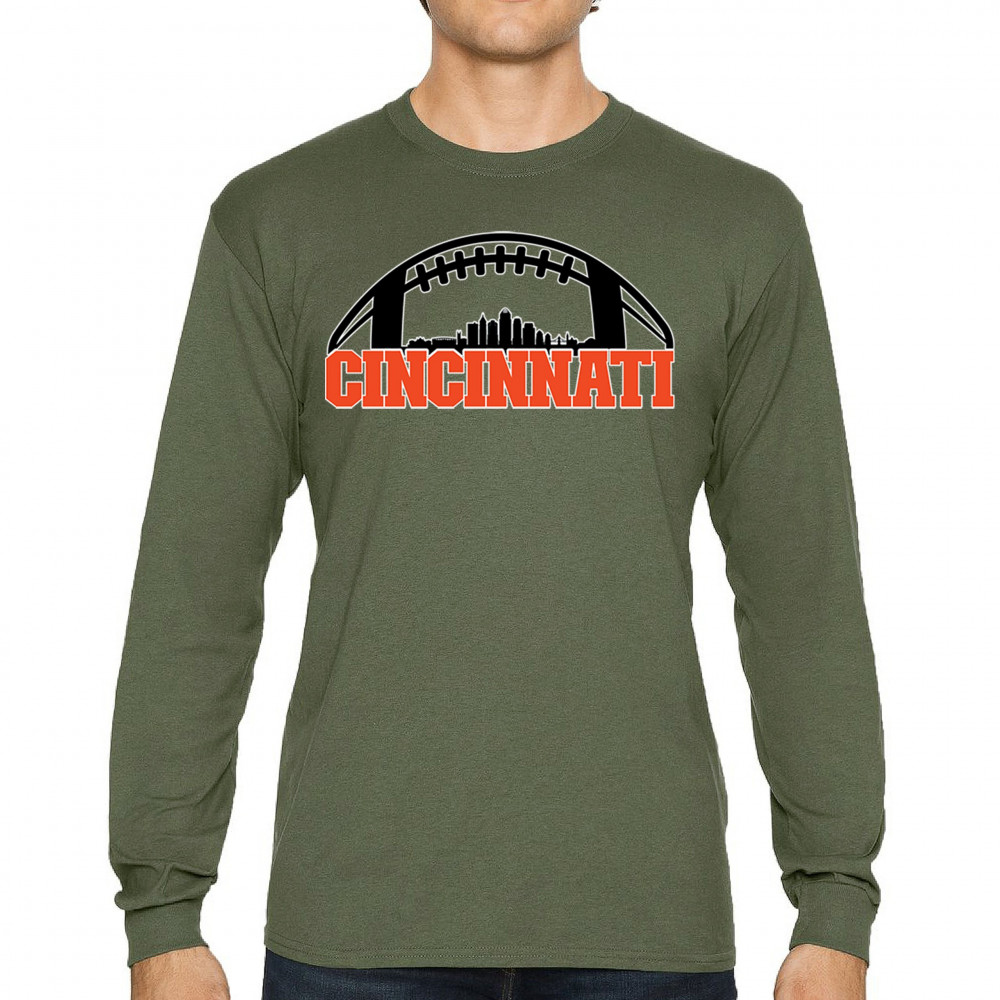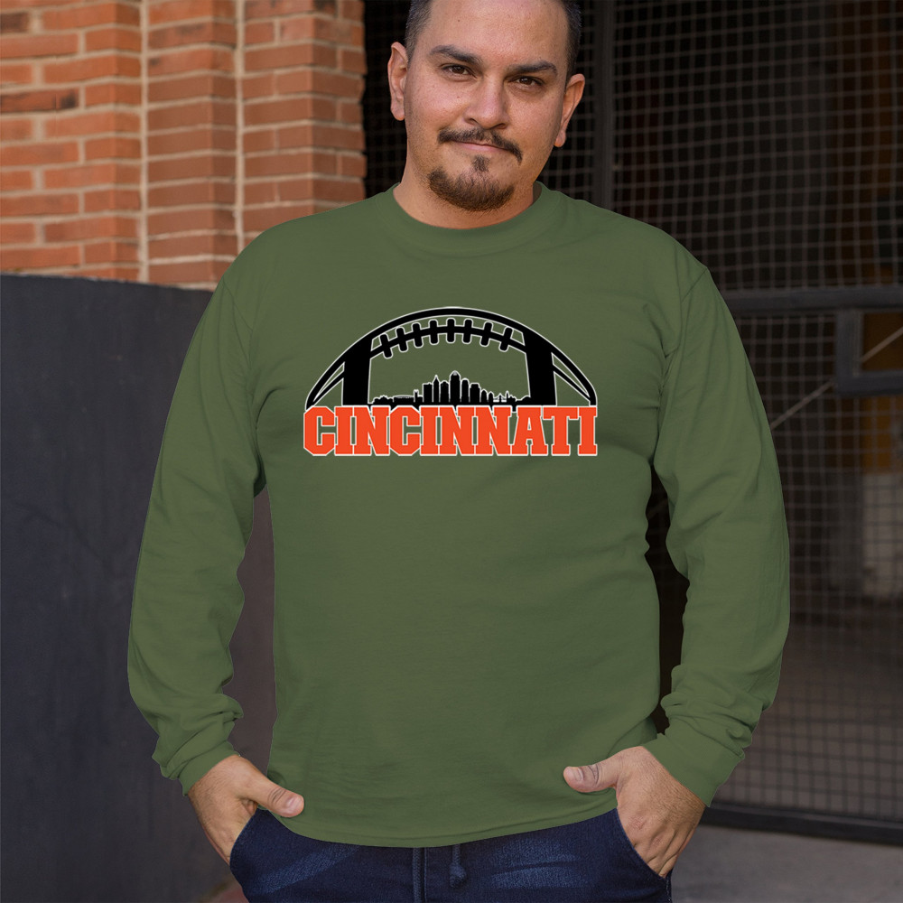 Celebrate Cincinnati and football with this bold skyline design under a football arch. Perfect for fans, tailgates, and game days!