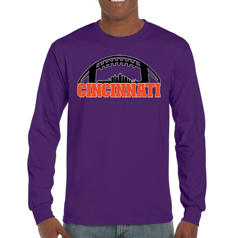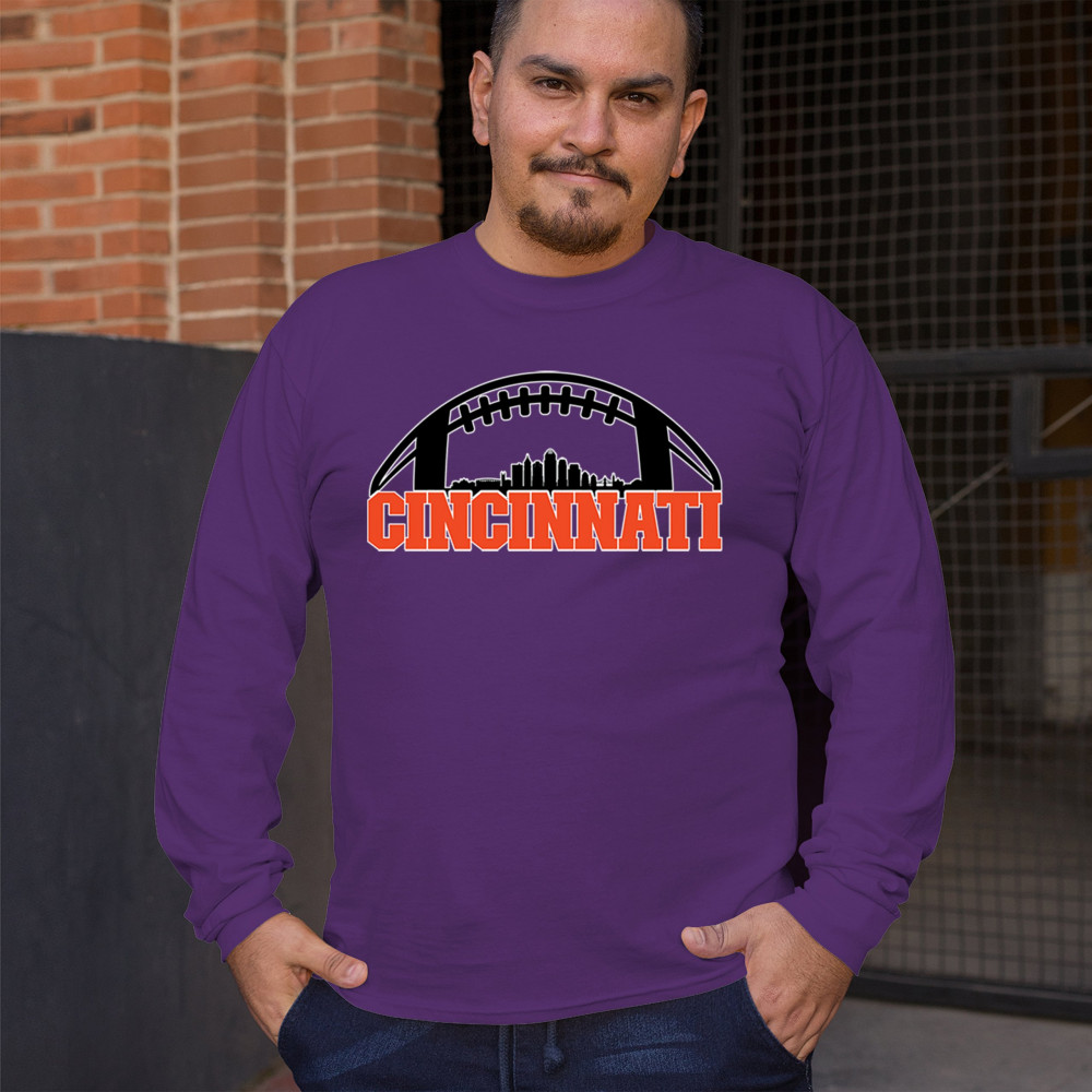 Discover the perfect blend of football passion and Cincinnati pride with this eye-catching design. Featuring the Queen City skyline under a bold football arch, this graphic is ideal for fans cheering on their team or celebrating their love for the city. Whether at a tailgate, game, or casual outing, this design lets you show your loyalty in style. A thoughtful gift for Cincinnati football enthusiasts!