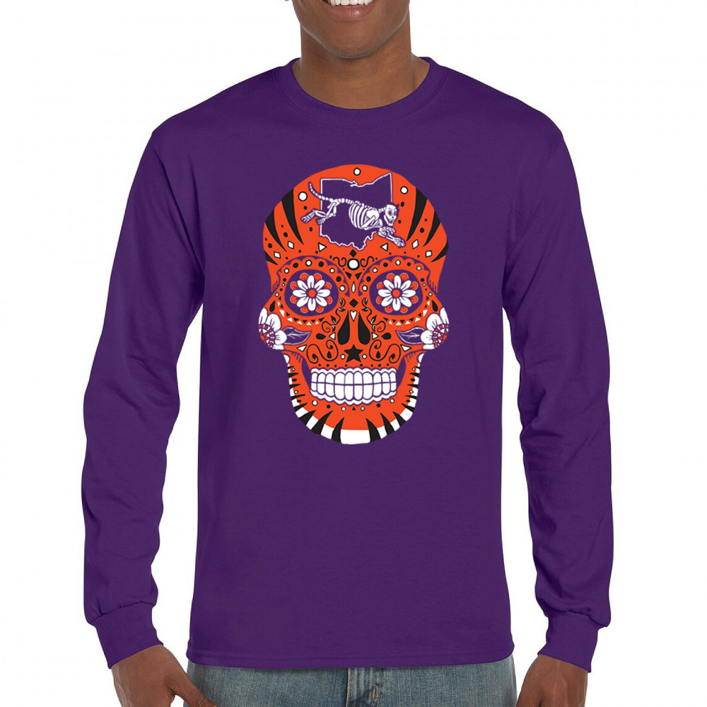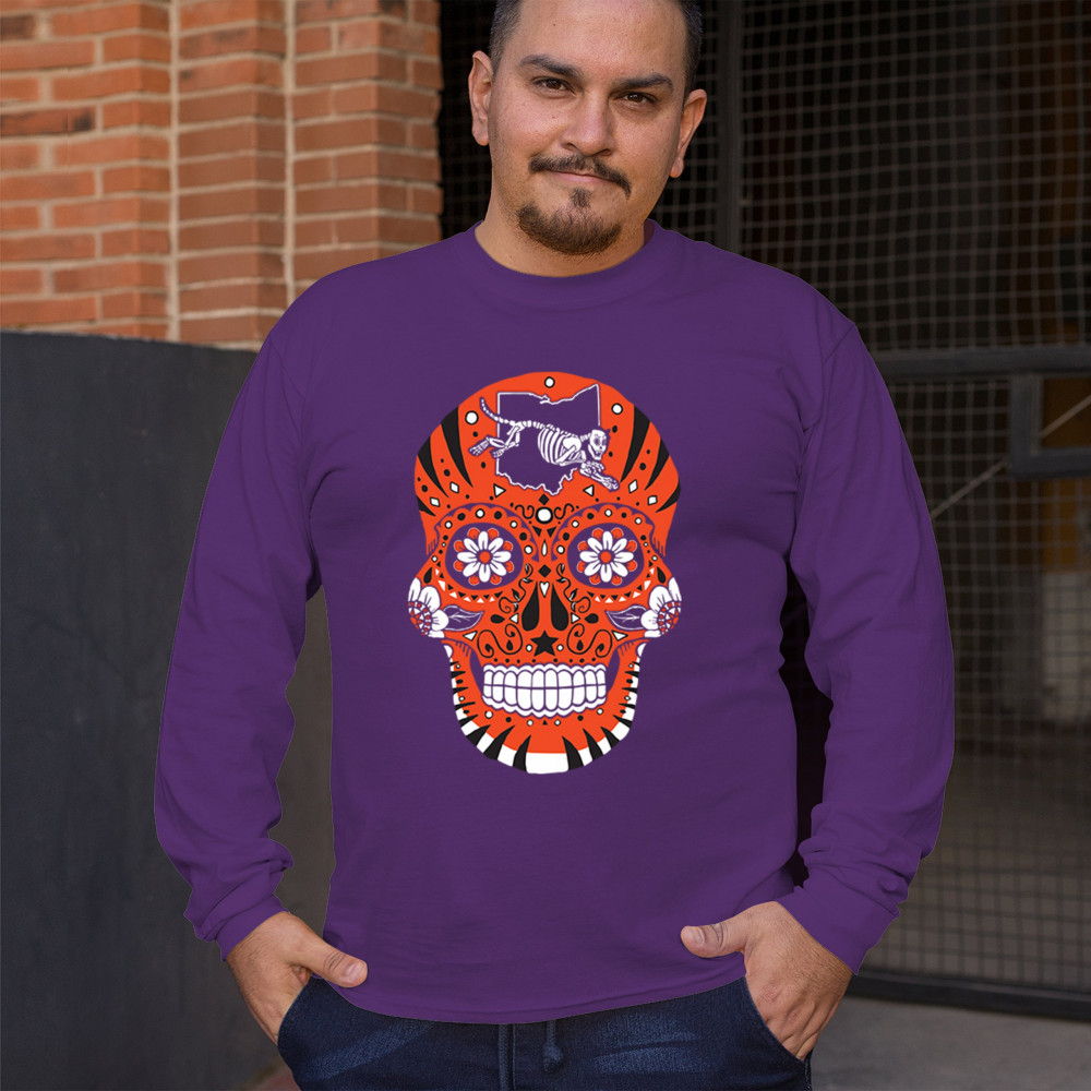 Cinci Sugar Skull with Queen City Paw, underdog grit, black & orange pride, Game Day energy, and playoff vibes.