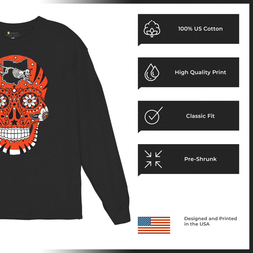 Cinci Sugar Skull with Queen City Paw, underdog grit, black & orange pride, Game Day energy, and playoff vibes.