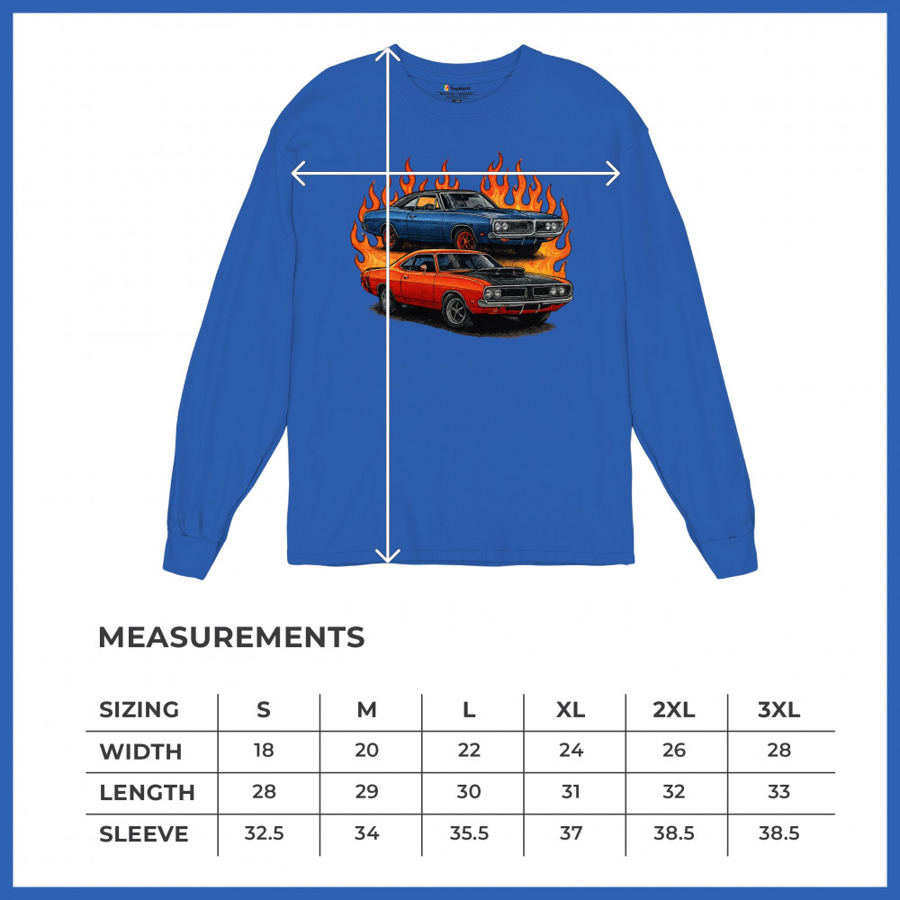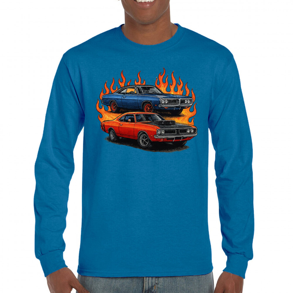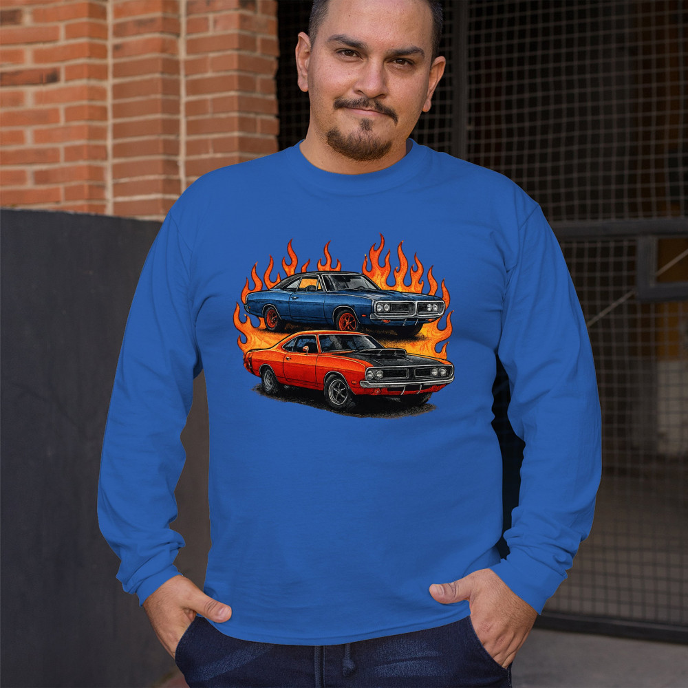 Bold flame design with classic muscle cars for gearheads and vintage horsepower lovers. Perfect for shows, cruise meets, and burnout nights.