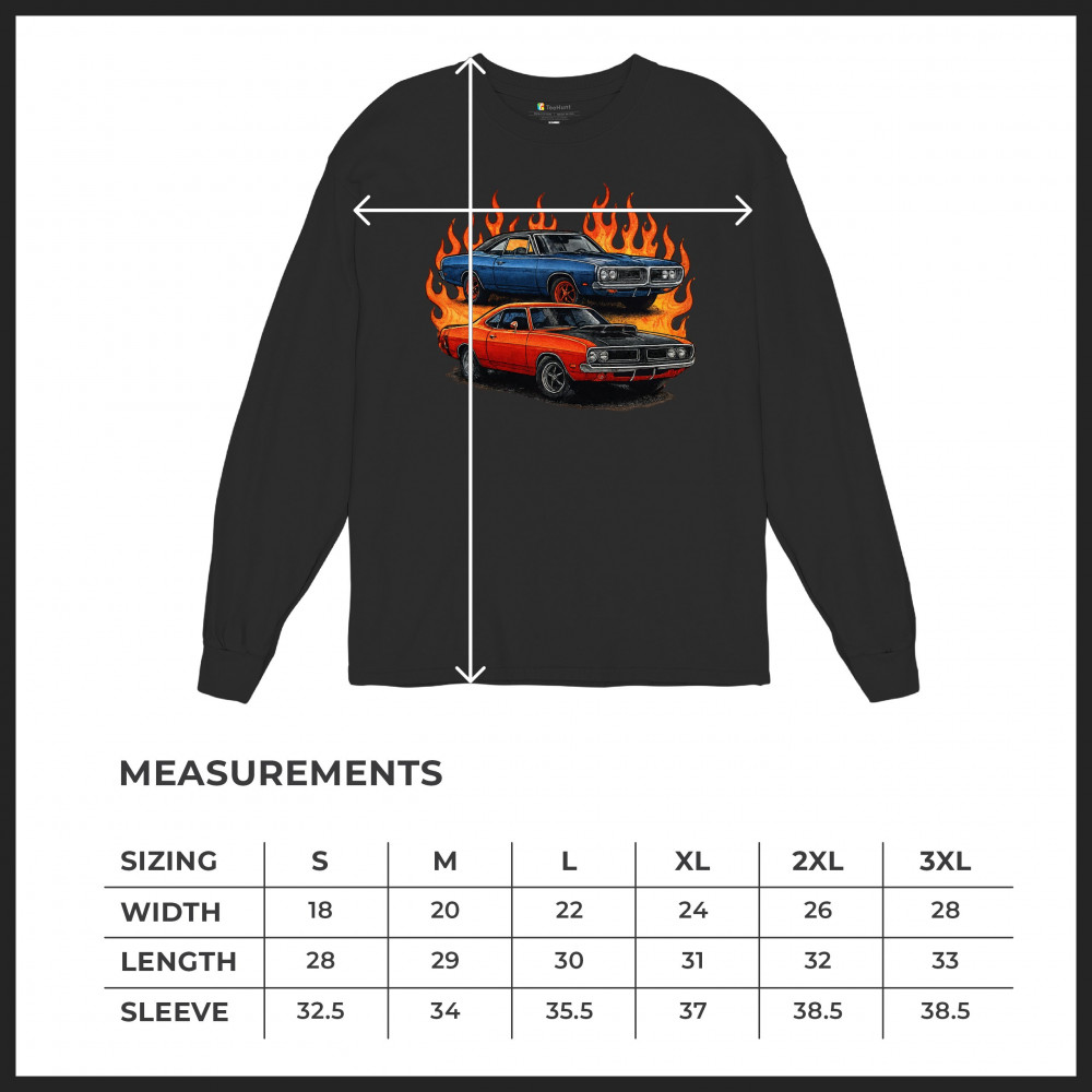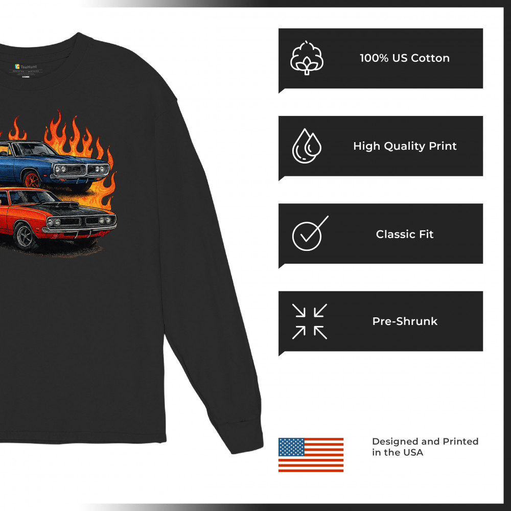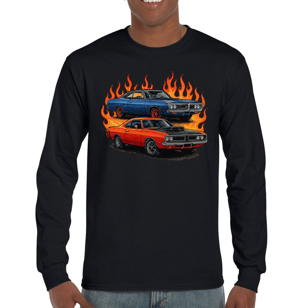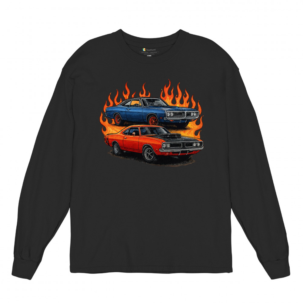 Bold flame design with classic muscle cars for gearheads and vintage horsepower lovers. Perfect for shows, cruise meets, and burnout nights.