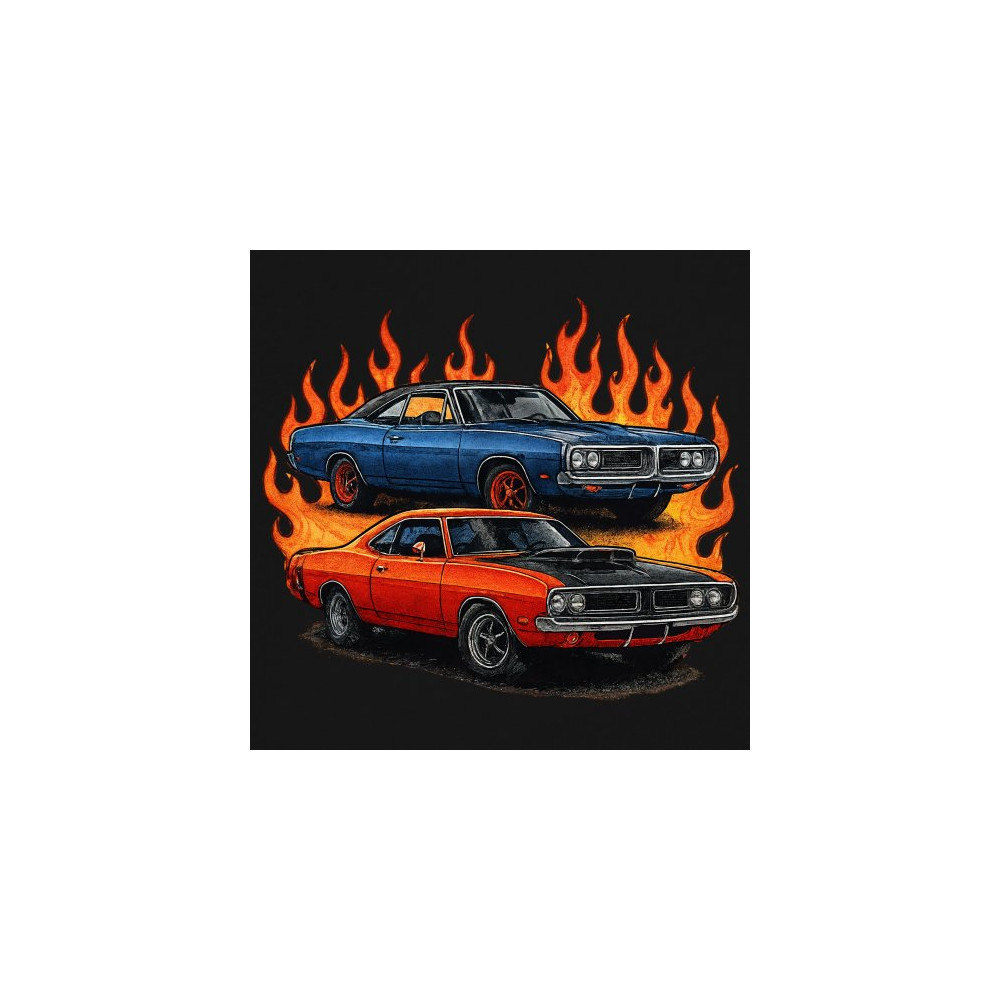 This flame-wrapped design showcases two classic muscle cars set ablaze with attitude, style, and vintage horsepower. Made for adrenaline seekers, rev heads, and car lovers who thrive on raw speed and retro fire. Whether at a burnout meet or a car show, this design lets your muscle car pride burn bright.