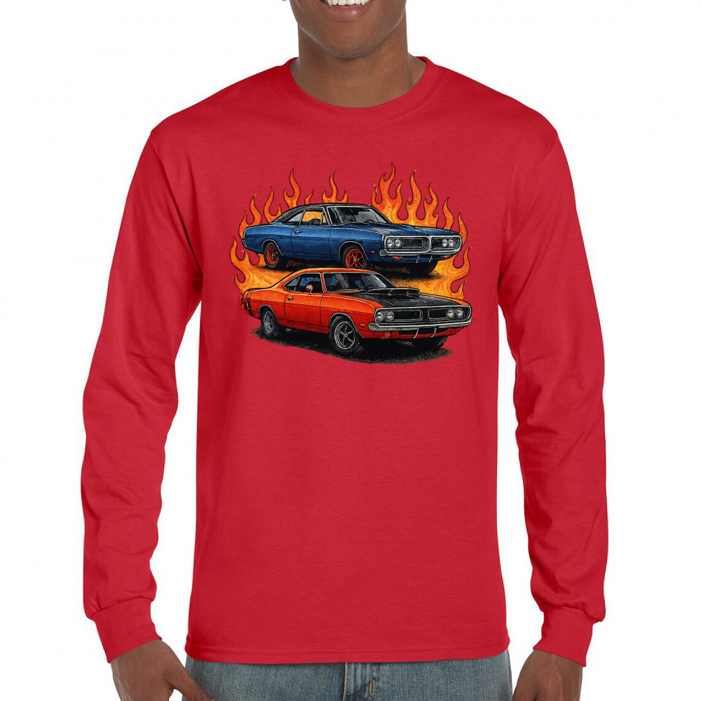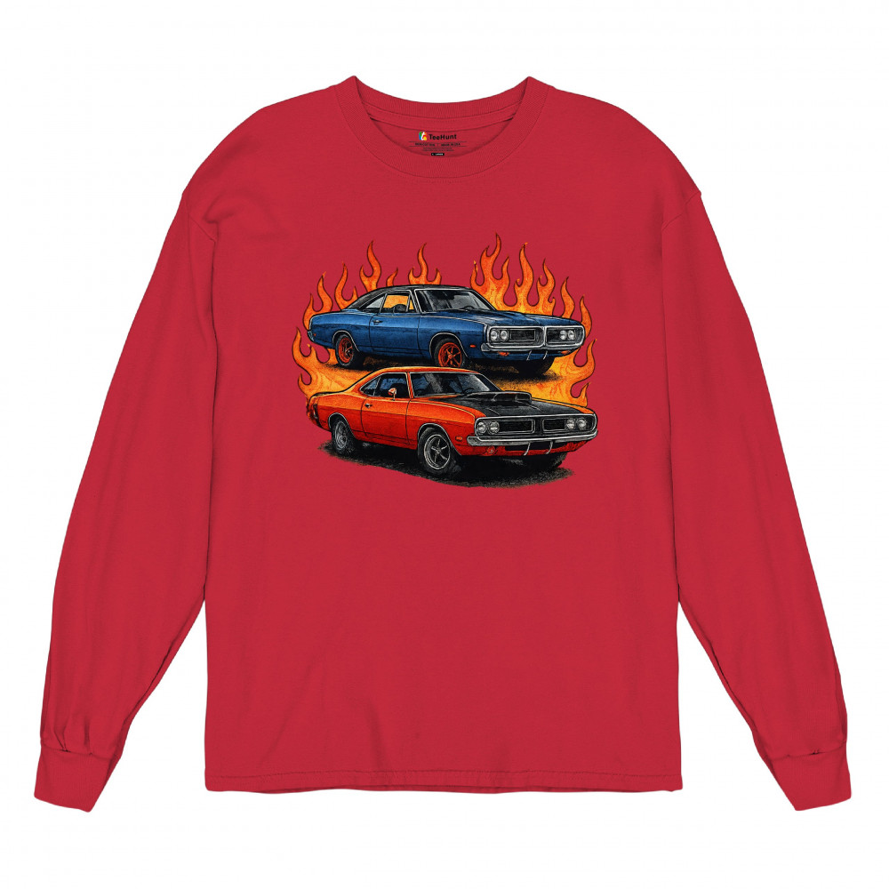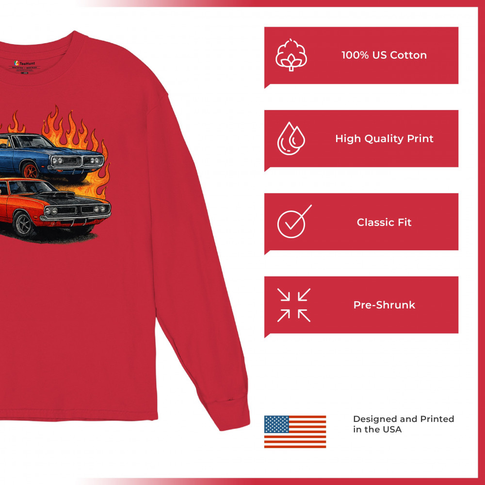 Bold flame design with classic muscle cars for gearheads and vintage horsepower lovers. Perfect for shows, cruise meets, and burnout nights.