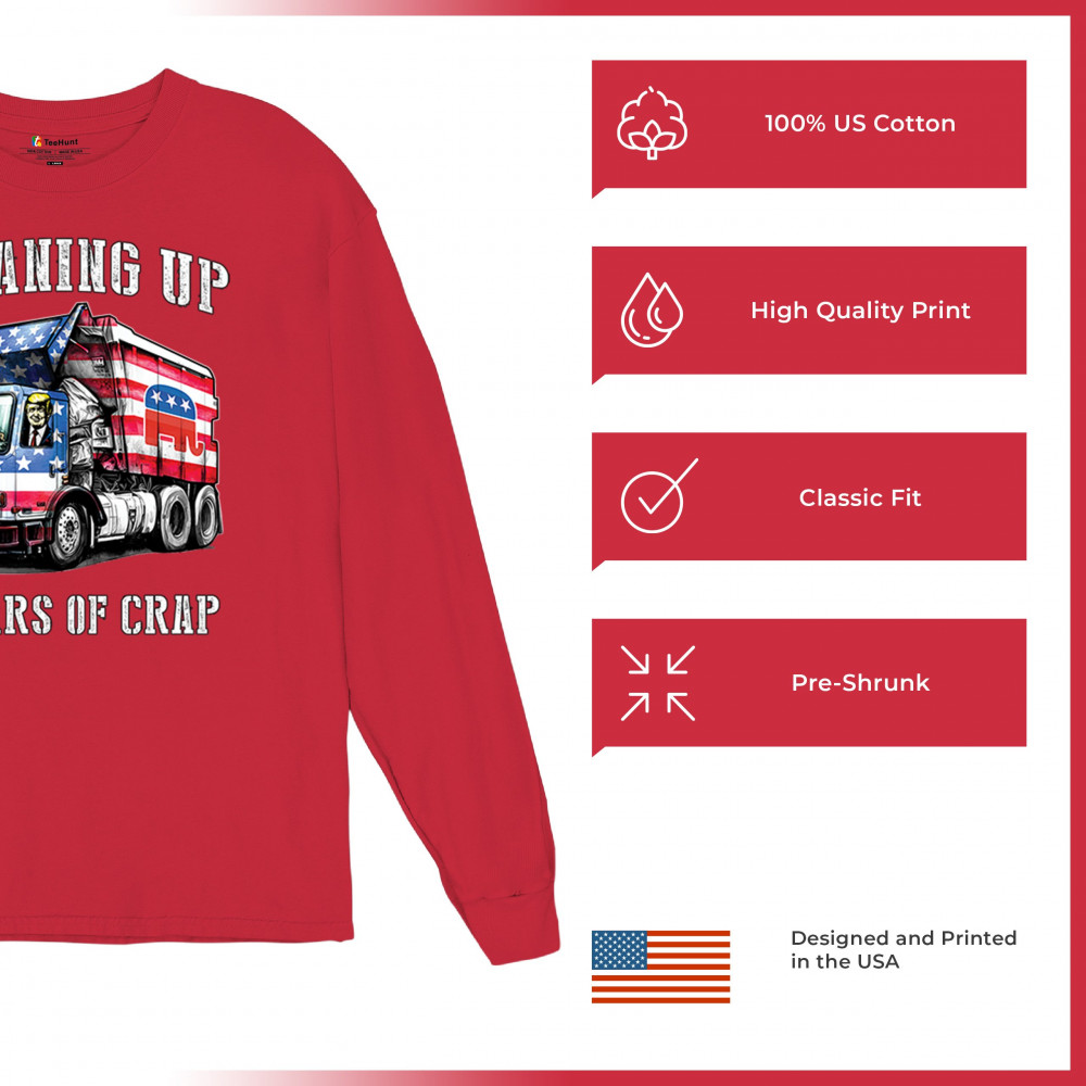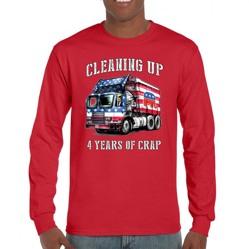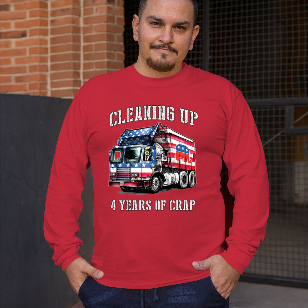 Bold "Cleaning Up 4 Years of Crap" design featuring Trump, the GOP, and the American flag. Perfect for proud conservatives and patriots.