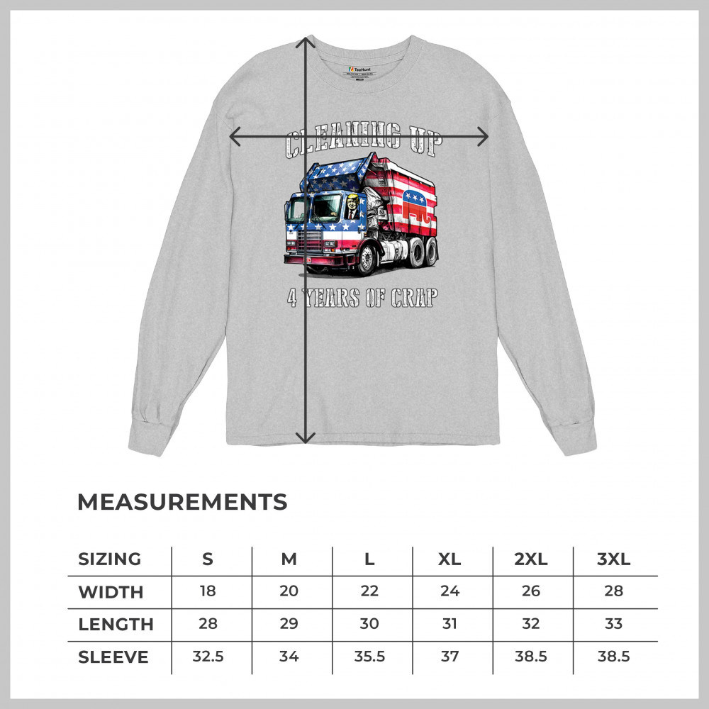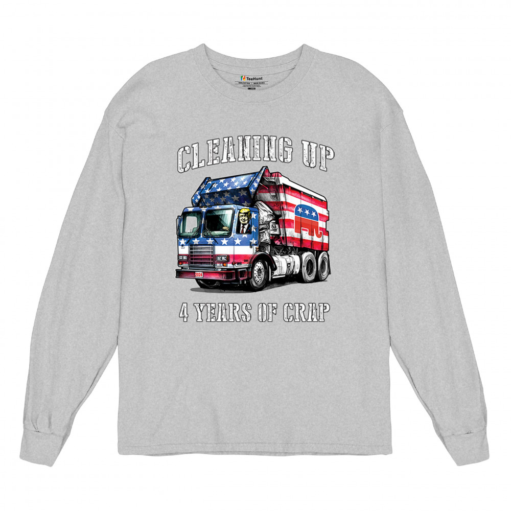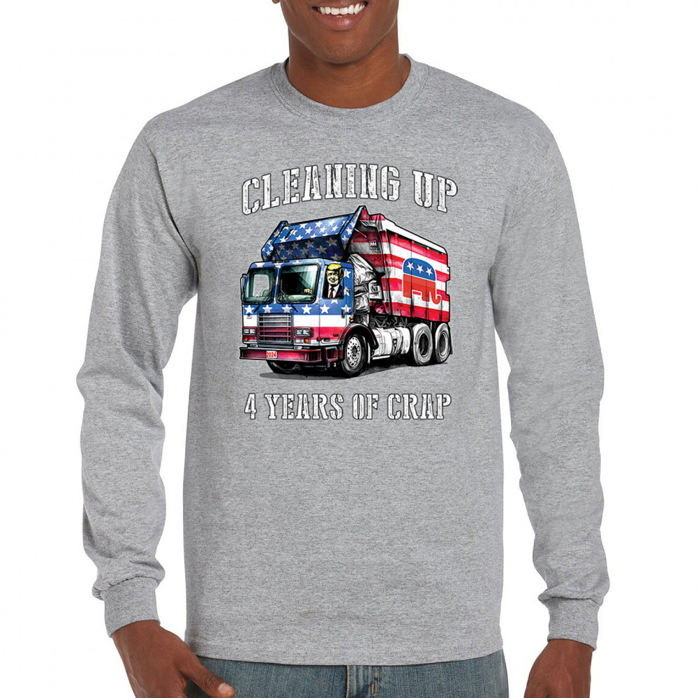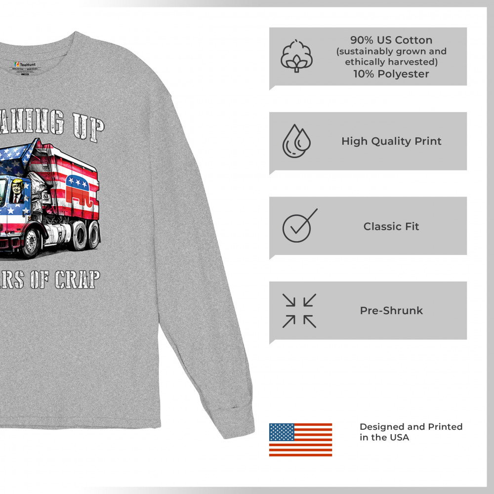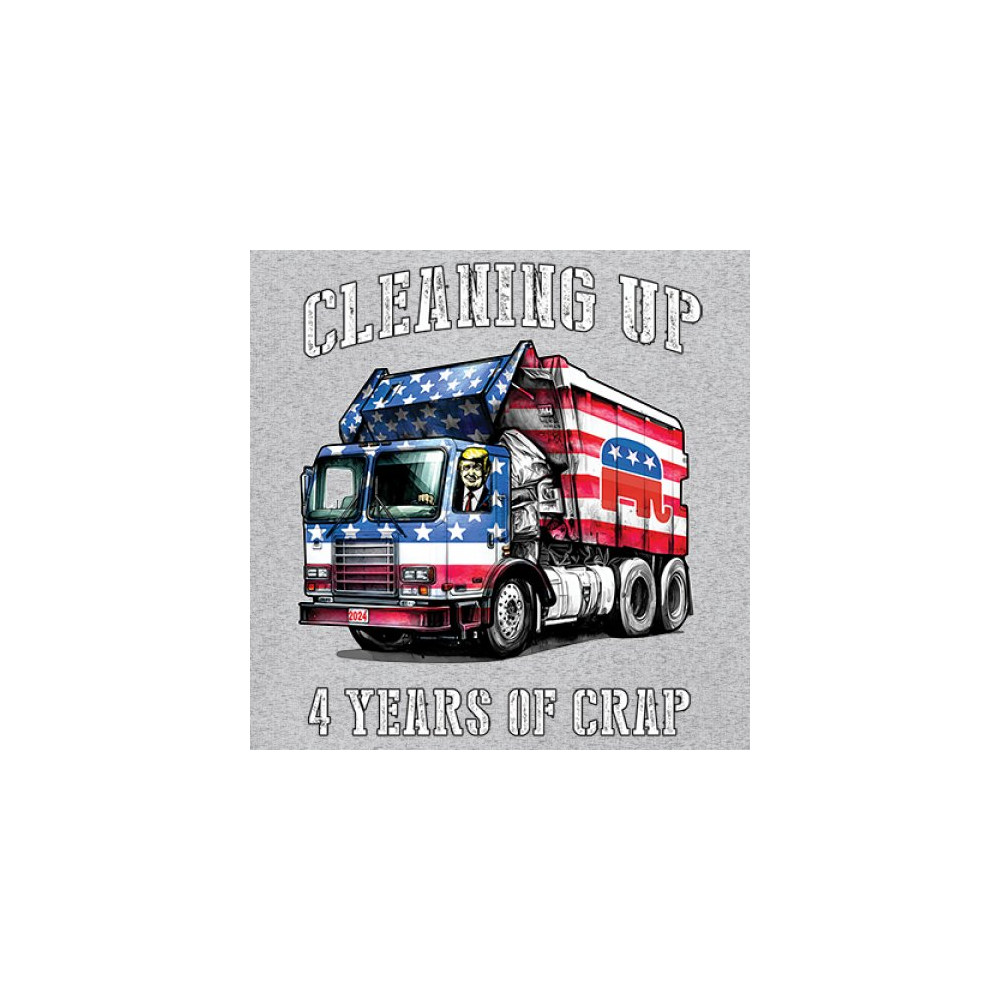 Bold "Cleaning Up 4 Years of Crap" design featuring Trump, the GOP, and the American flag. Perfect for proud conservatives and patriots.