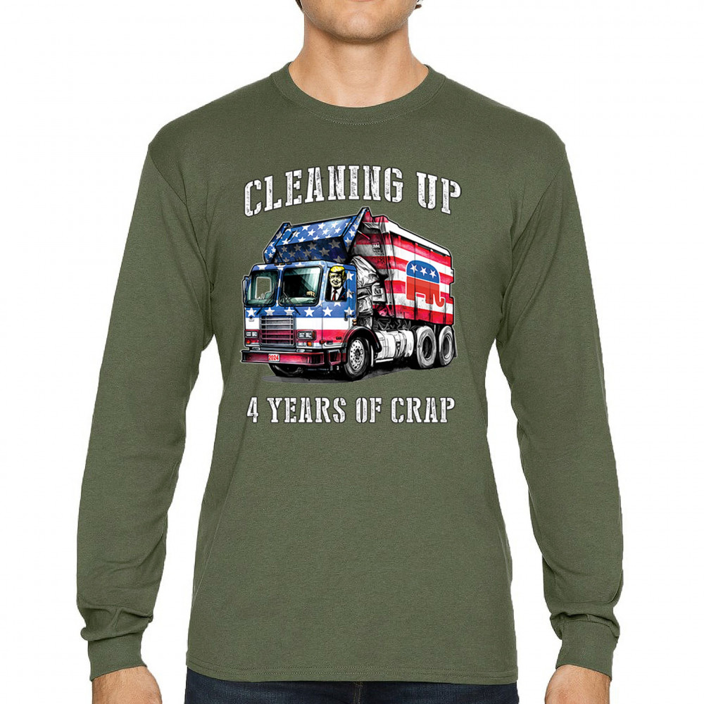 Bold "Cleaning Up 4 Years of Crap" design featuring Trump, the GOP, and the American flag. Perfect for proud conservatives and patriots.