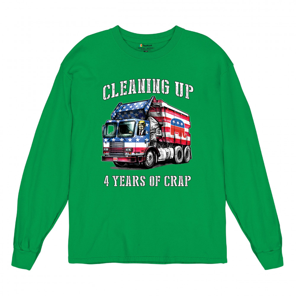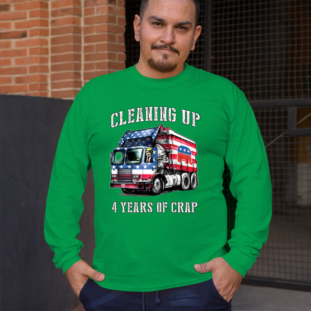 Bold "Cleaning Up 4 Years of Crap" design featuring Trump, the GOP, and the American flag. Perfect for proud conservatives and patriots.