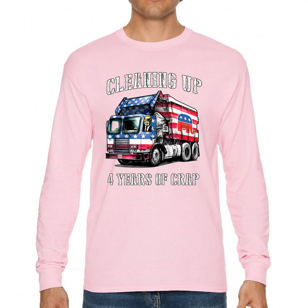 Bold "Cleaning Up 4 Years of Crap" design featuring Trump, the GOP, and the American flag. Perfect for proud conservatives and patriots.