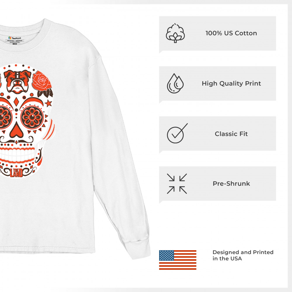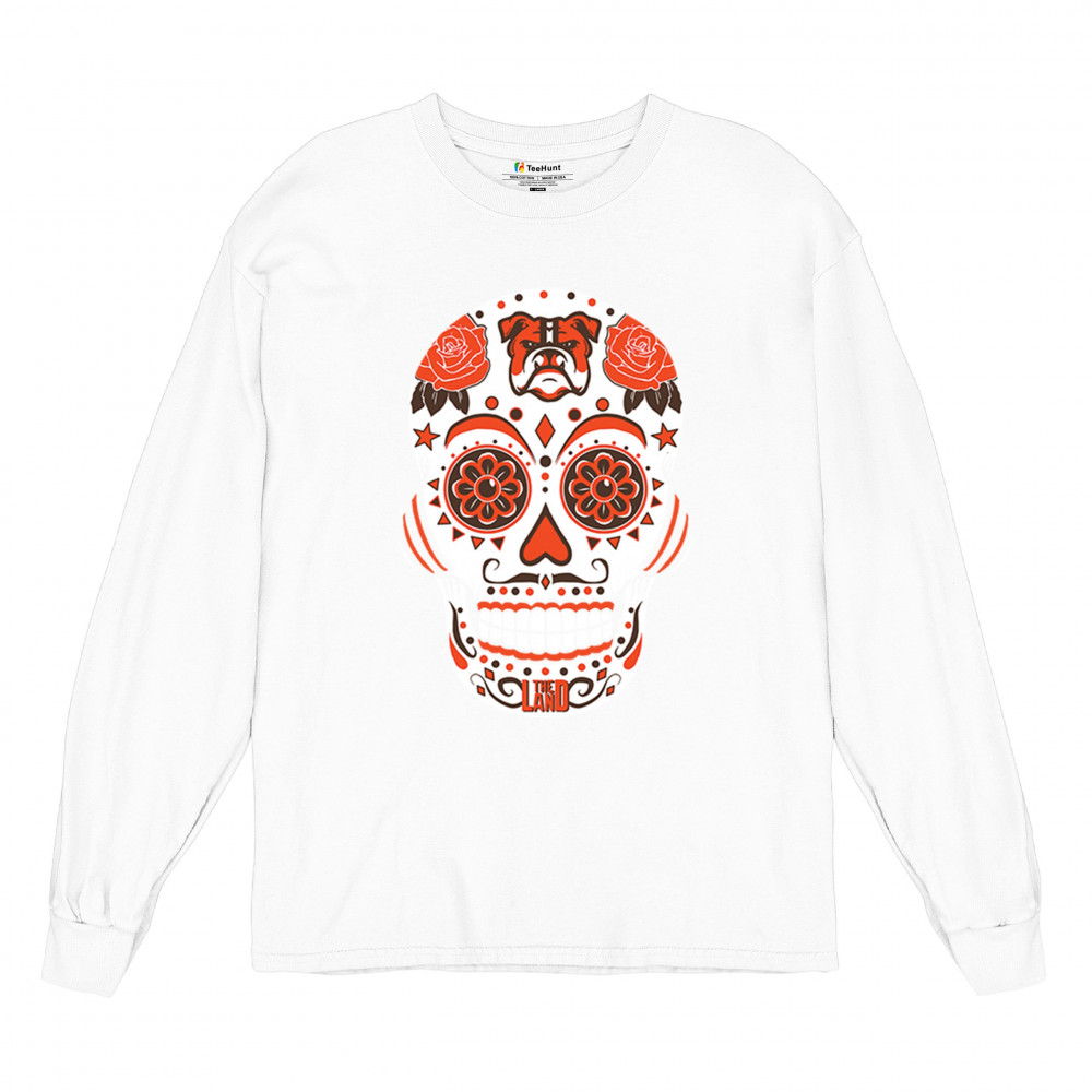 Cleveland Sugar Skull with Lake Erie pride, Rust Belt football grit, orange & brown tradition, playoff vibes, and Game Day passion.