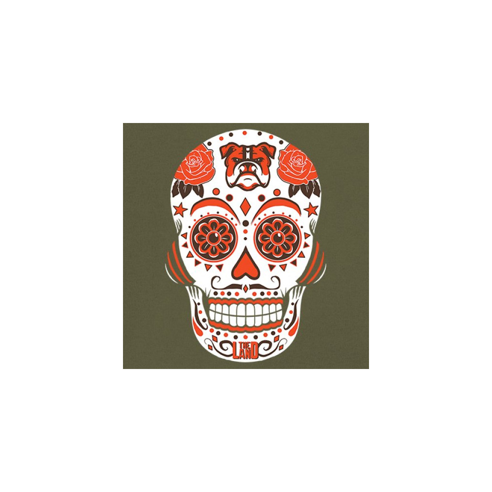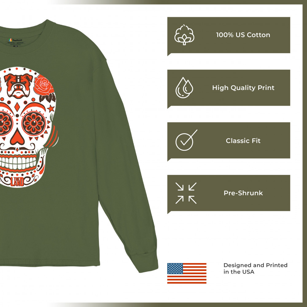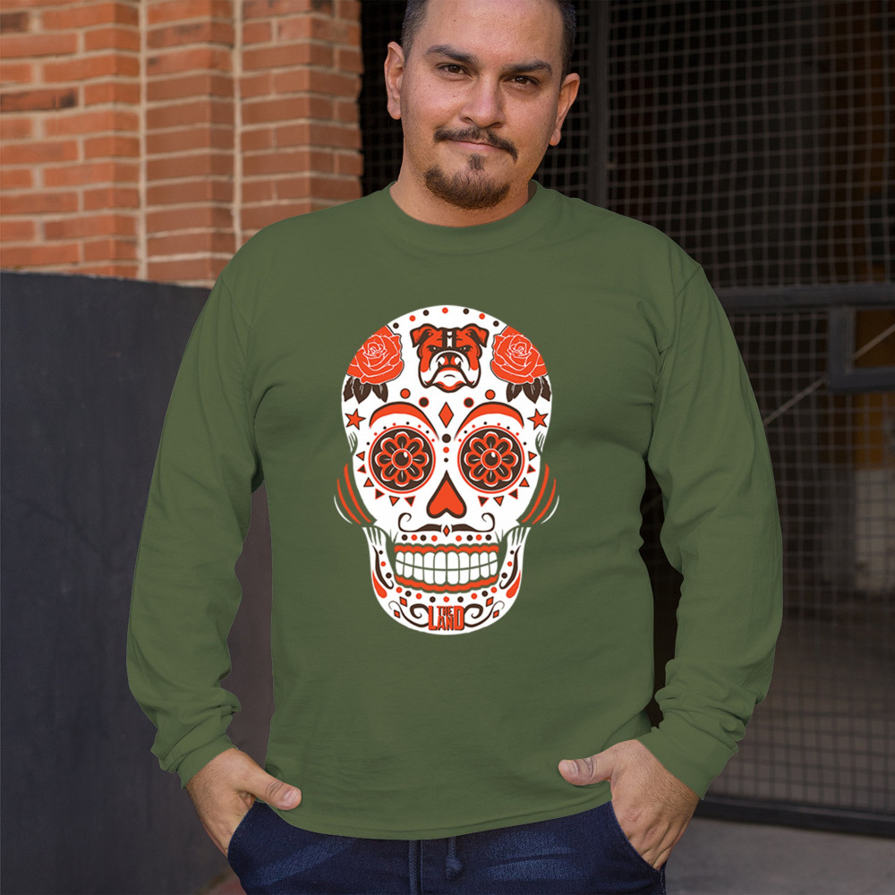 Cleveland Sugar Skull with Lake Erie pride, Rust Belt football grit, orange & brown tradition, playoff vibes, and Game Day passion.
