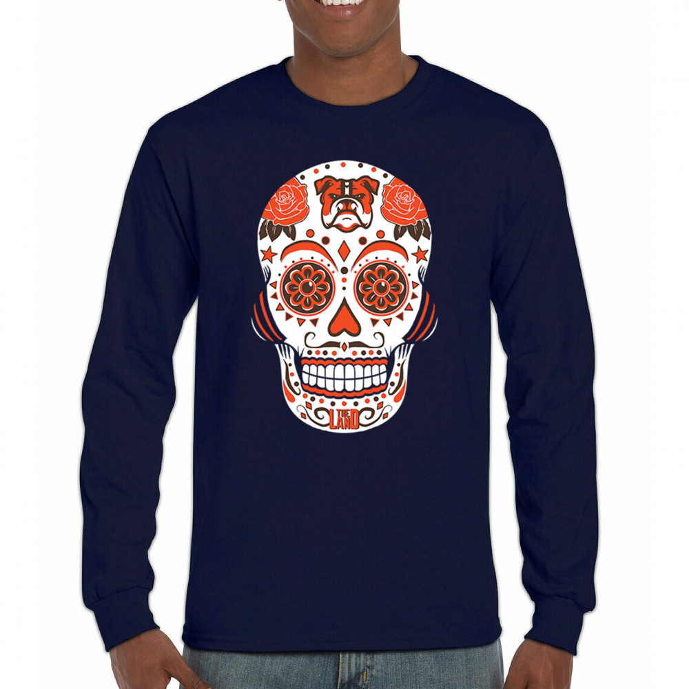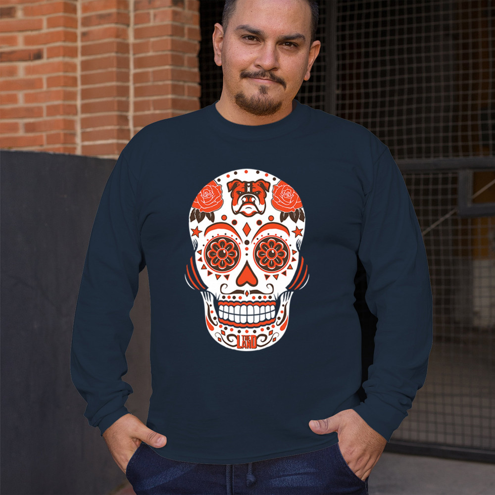 Cleveland Sugar Skull with Lake Erie pride, Rust Belt football grit, orange & brown tradition, playoff vibes, and Game Day passion.